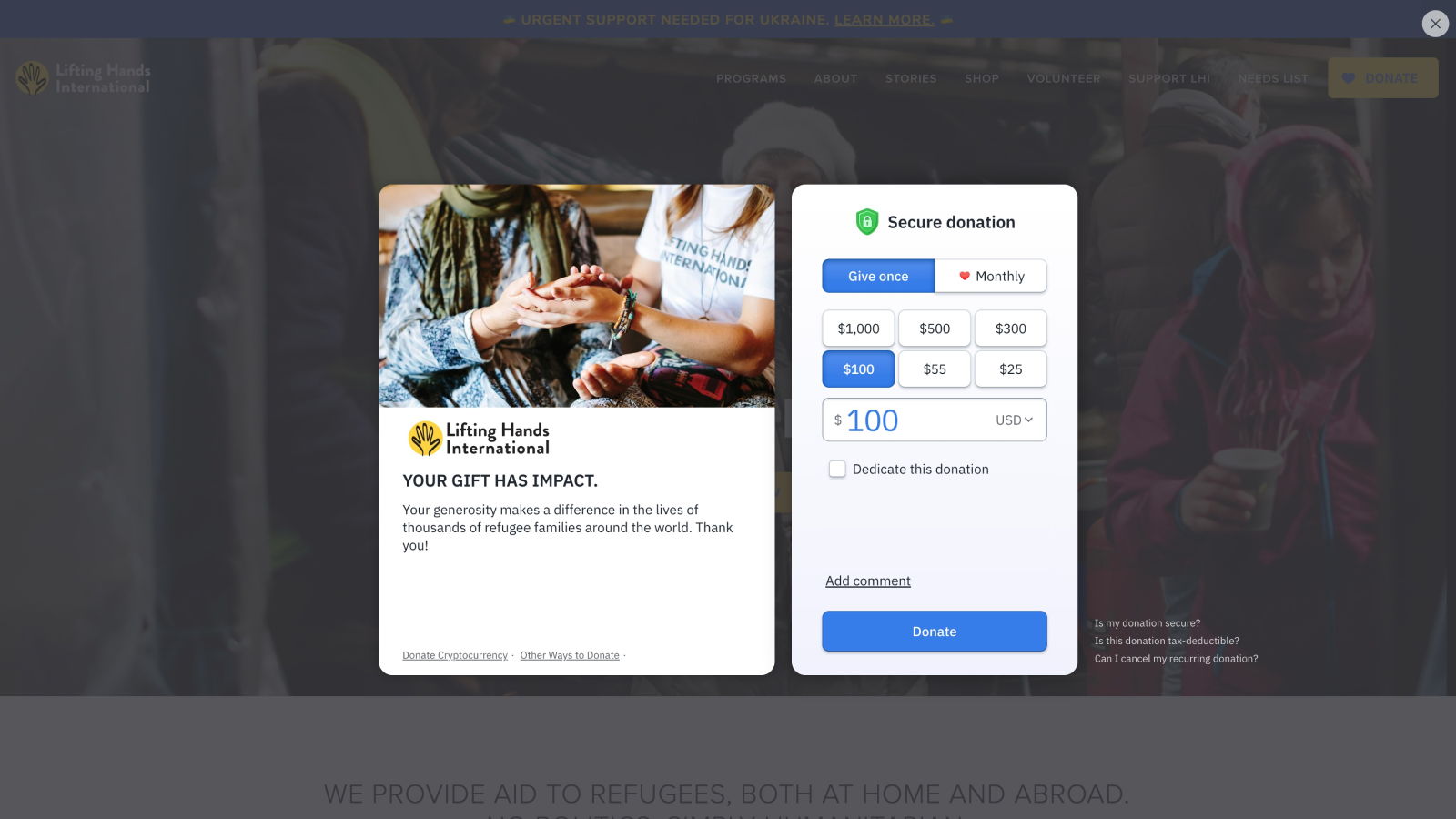 When an interested donor clicks on the yellow and blue donate button at the top-right-hand corner of Lifting Hands International’s website, they are prompted with an on-site donation checkout. Additionally, if the donor exits out of the donation checkout because they want to learn more about your mission, there’s a donation reminder at the bottom-right-hand corner for whenever they are ready to make that donation.