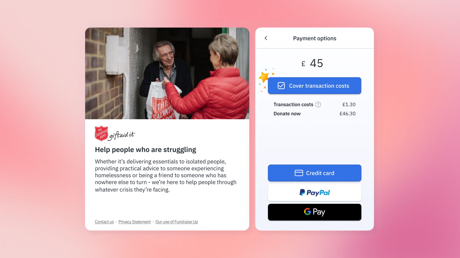 As a nonprofit, you want to do everything you can to lower donation abandonment and increase donor conversion. For The Salvation Army UK, Fundraise Up’s on-site donation ask — paired with a simplified AI-powered donation checkout — helped bring its donor conversion rate up to 49%.