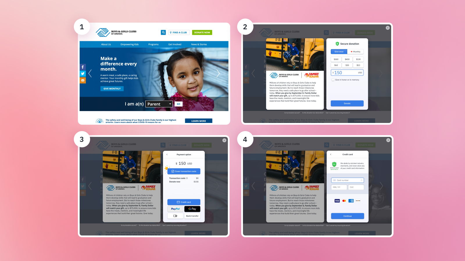 The potential donor is reminded at every step of the donation process that they are giving to the Boys and Girls Clubs of America. The organization does a great job at keeping its branding consistent — with its renowned logo, messaging, and photos reflected at each step. Plus, with Fundraise Up, the donor is kept on the same screen throughout the donation process, ensuring that each donor is receiving an experience that isn’t interrupted by a redirect.