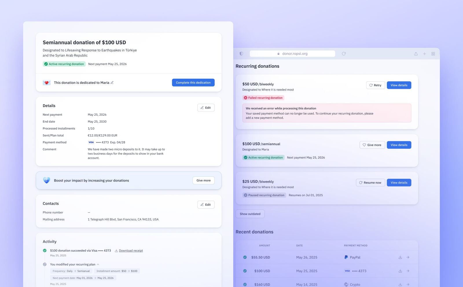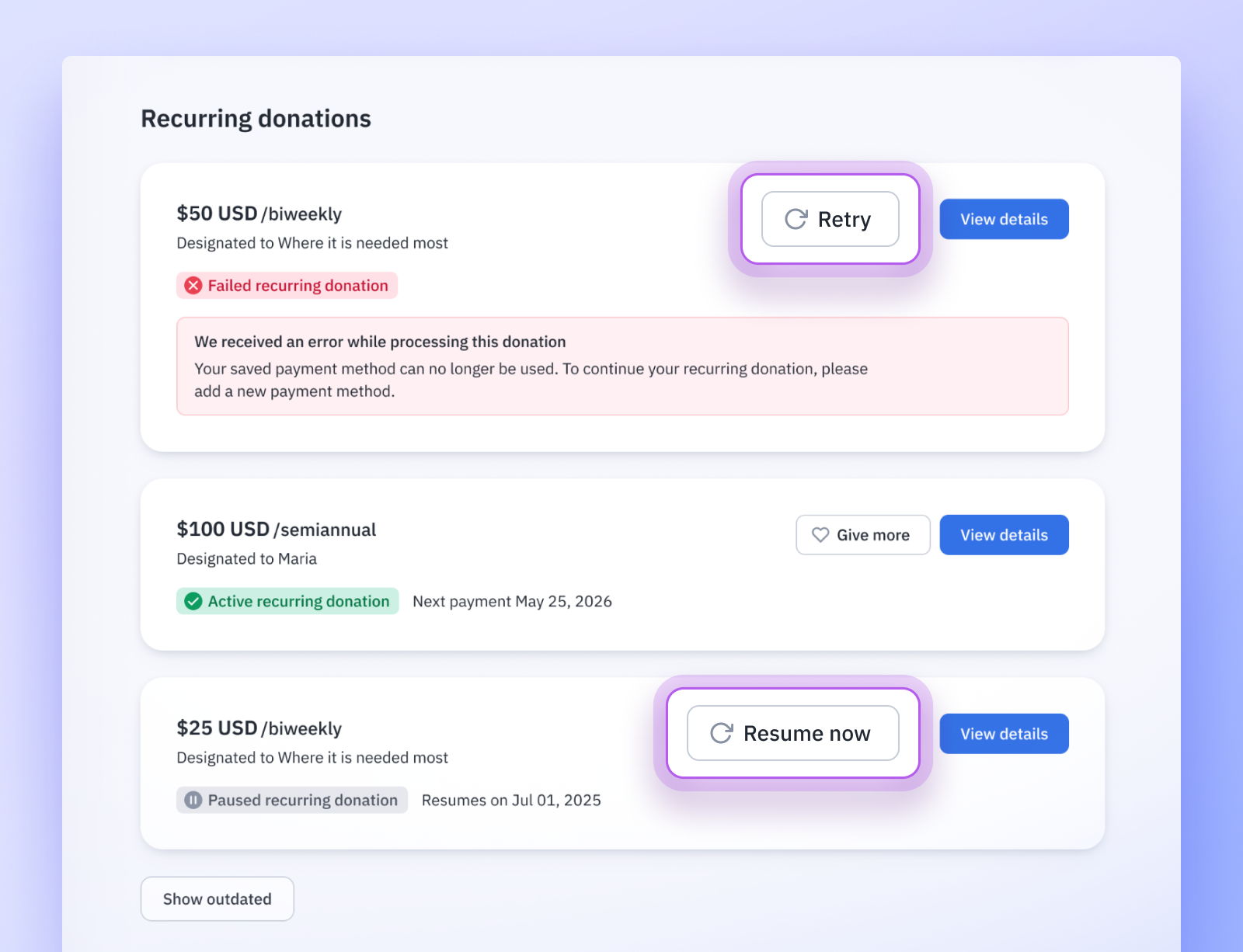 Supporters see what they need to know, right away. When a payment issue occurs, action buttons like “Retry” or “Resume” appear instantly, enabling supporters to resolve problems themselves.