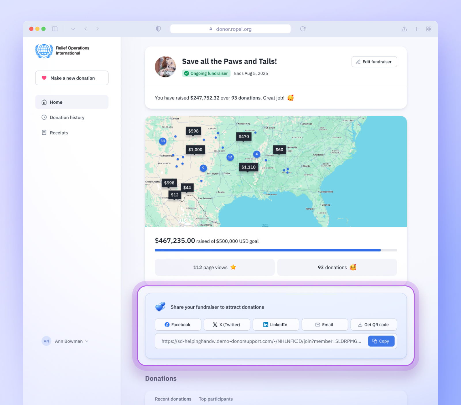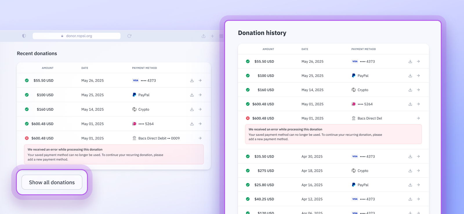 No more digging through cluttered pages for receipts. The new “Show all donations” link makes it simple for supporters to view their entire giving history with one click—saving time and support requests.