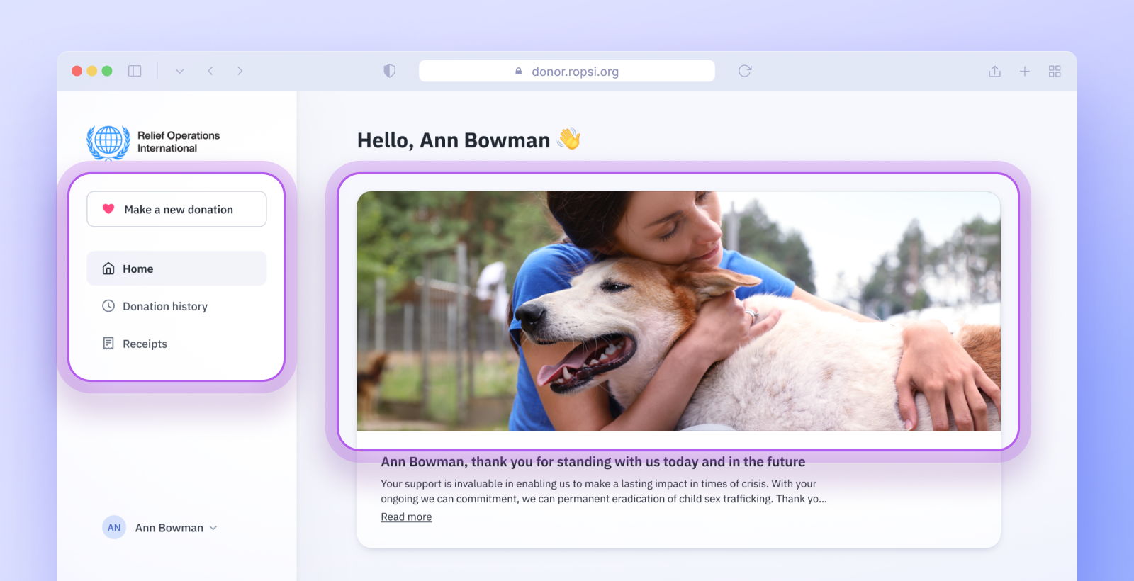 Supporters land on a home page that feels more personal and intuitive. The new sidebar keeps key features within easy reach, making navigation a breeze. A larger, more flexible hero image allows your organization to vividly showcase your mission and programs.