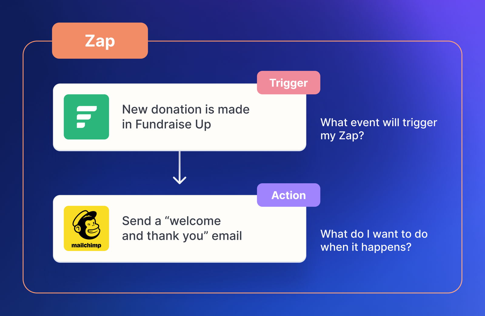 Most nonprofit teams use multiple digital tools to manage donor data, but these tools often don’t work together seamlessly. By connecting Fundraise Up with your team’s daily apps through Zapier’s automated workflows (called "Zaps"), you can save time on repetitive tasks like sending thank-you emails and updating donor records. There’s no need for developers — Zapier connects your essential tools without requiring technical knowledge, helping your team create automated workflows so they can focus on more impactful work.