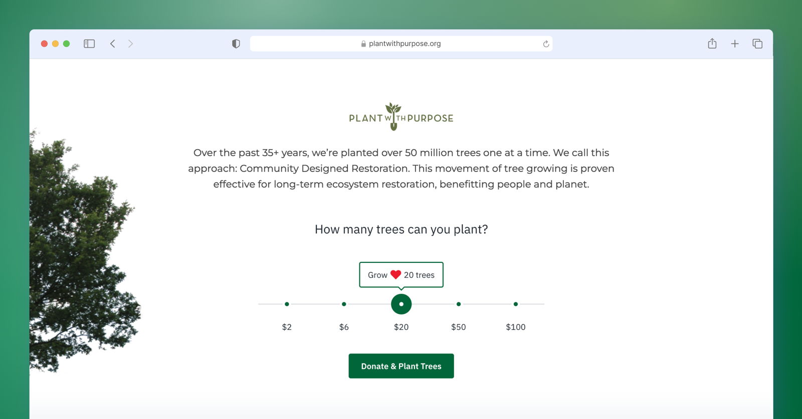 Plant With Purpose adds Fundraise Up’s interactive impact slider to its GivingTuesday landing page. This helps donors understand how many trees they can grow with a single donation.