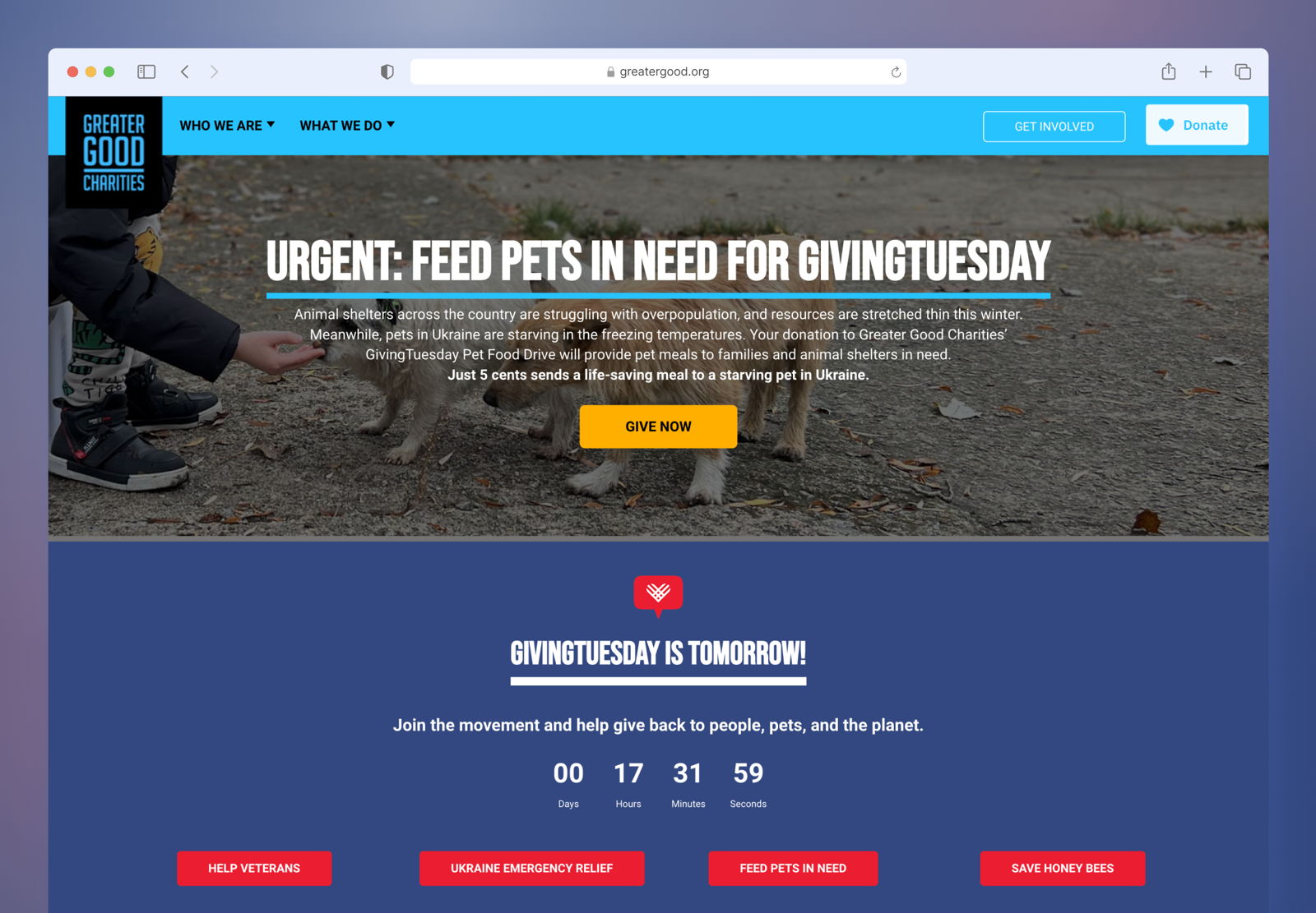 For GivingTuesday, Greater Good Charities lets donors choose from four different cause areas and provides a unique landing page for each one.