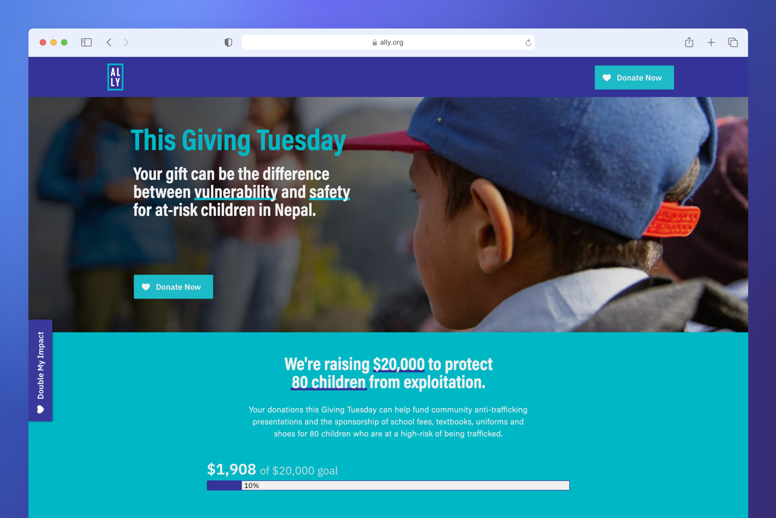 Creating a campaign-specific landing page provides donors with additional information about what you’re doing for GivingTuesday and why it matters. On Ally Global Foundation’s GivingTuesday landing page, the organization highlights how it plans to help at-risk children in Nepal and shares moving stories to encourage donor support. It also includes multiple calls to action across the page and a goal meter so supporters can stay informed about campaign performance.