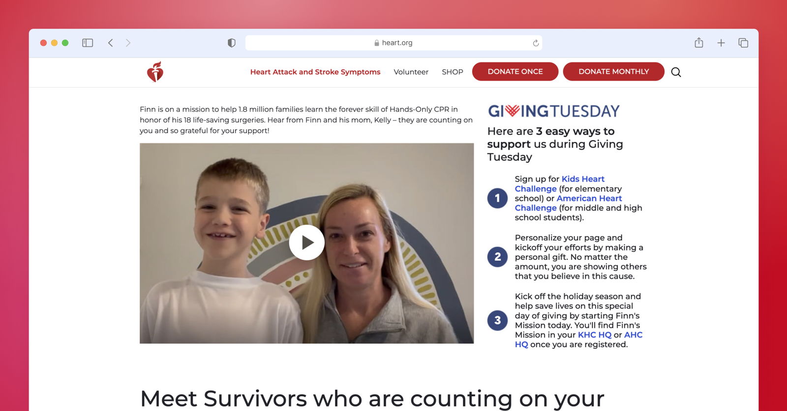 Engage new supporters on GivingTuesday and during the year-end season by directly telling people how they can help. On its website, American Heart Association provides three ways for website visitors to offer their support. It even includes stories of the survivors to further encourage supporters to take action.