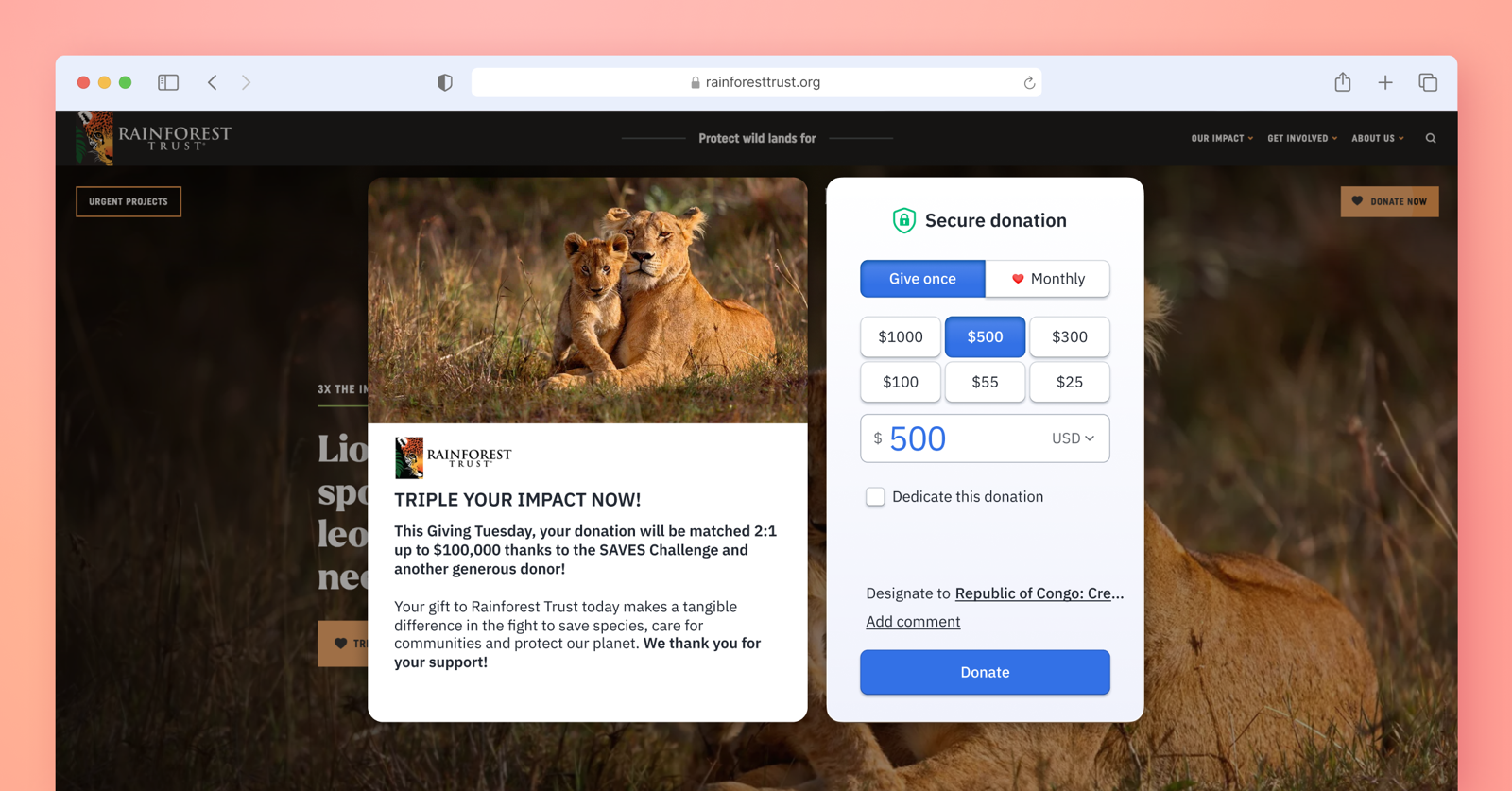 To further incentivize donors to make a donation on GivingTuesday, Rainforest Trust is running a matching-gift campaign. The organization features the campaign front and center on its website and in donation checkout, ensuring that donors don’t miss out on this opportunity to make 3x the impact.