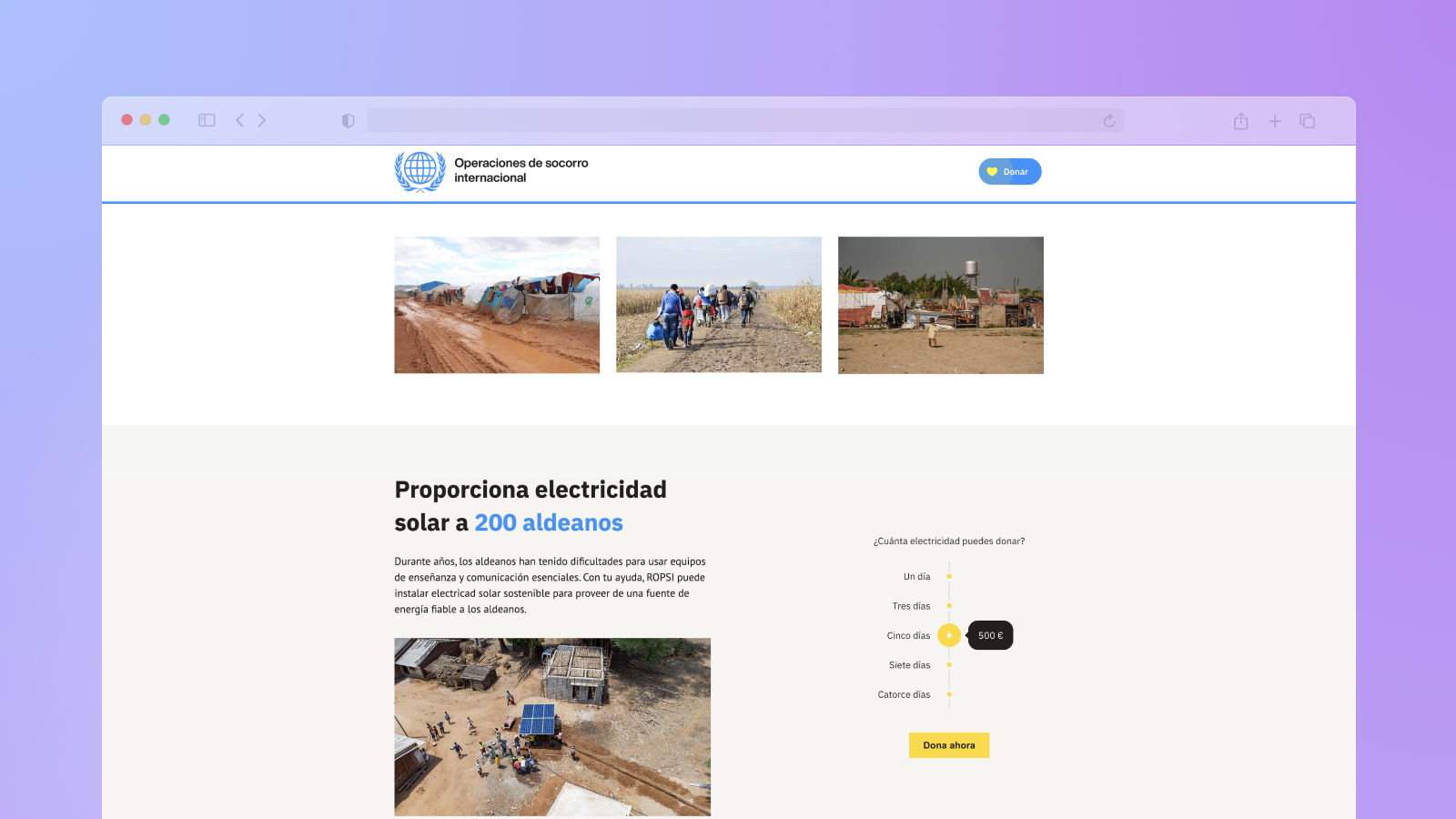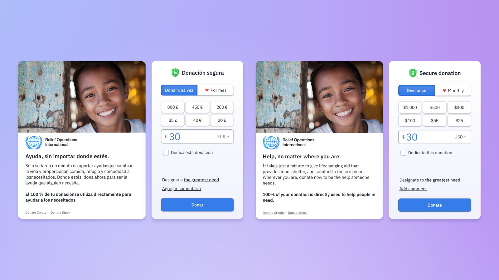 To see internationalization in action, take a look at this example of how website content can be tailored for English-speaking donors (top) and its Spanish-speaking donors (bottom):
