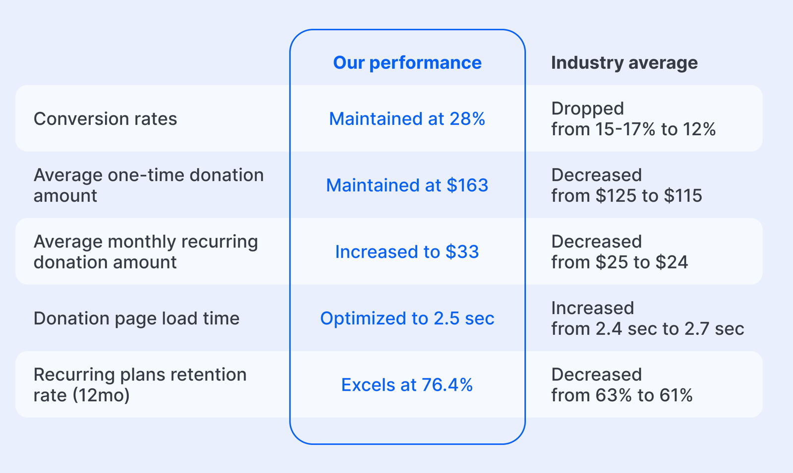 Only statistically significant findings drive action, meaning every improvement is backed by real data. If a test delivers better results, we roll out the change across the platform, ensuring all Fundraise Up nonprofits benefit from the latest optimizations.