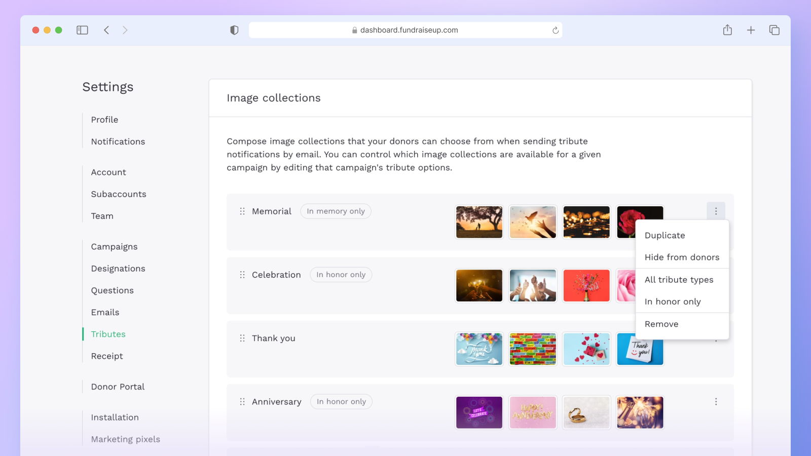 Now, you can create a collection of images and organize them by theme or sentiment. When a donor goes to share their dedication by email, they can now choose the image they feel best corresponds with their message.