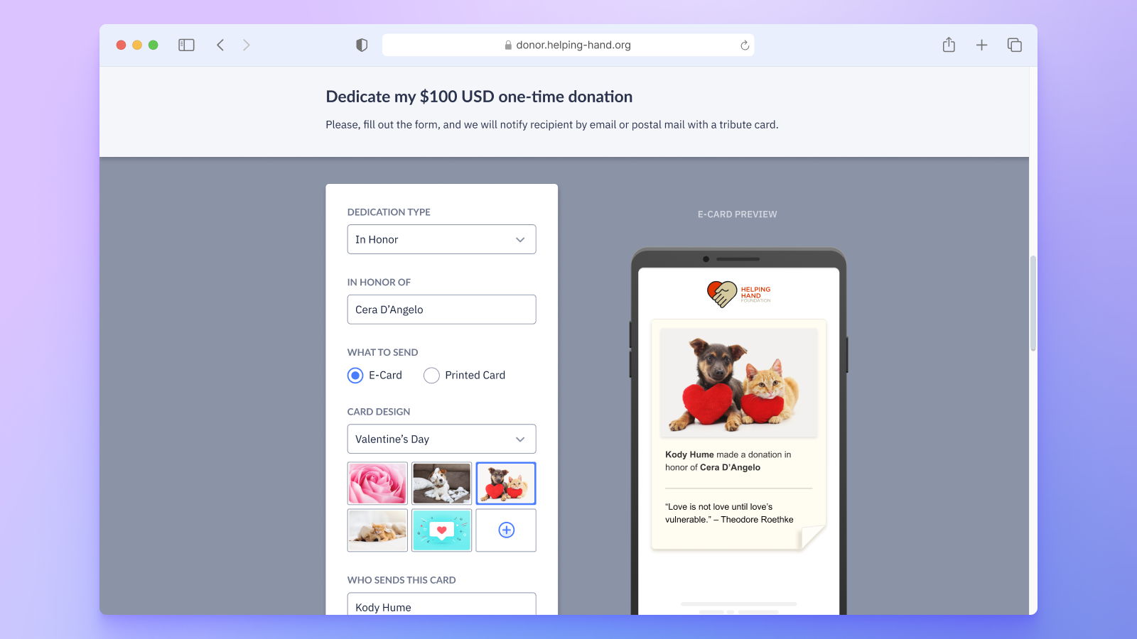 In this example, a donor will see the pre-selected Valentine's Day collection in their donor portal, where they can choose from one of four suggested images. For more evergreen campaigns you may be running, like those on your homepage, you can enable multiple collections for donors to cycle through and select the image of their choice. This provides your donors with a more bespoke dedication experience while keeping you in control of which images they can select.
