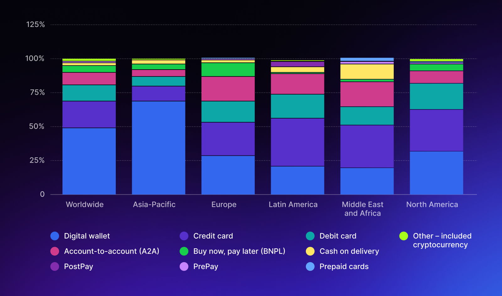 Market share of payment methods in total e-commerce transaction value worldwide in 2022, by region: https://www.statista.com/statistics/348004/payment-method-usage-worldwide/