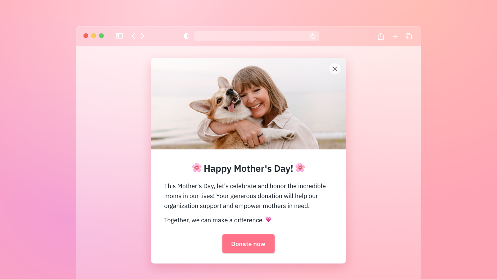 With Fundraise Up, you can easily guide donors to give on Mothers’ Day with our Popup element, which requires no extra code to install on your website and comes at no extra cost.