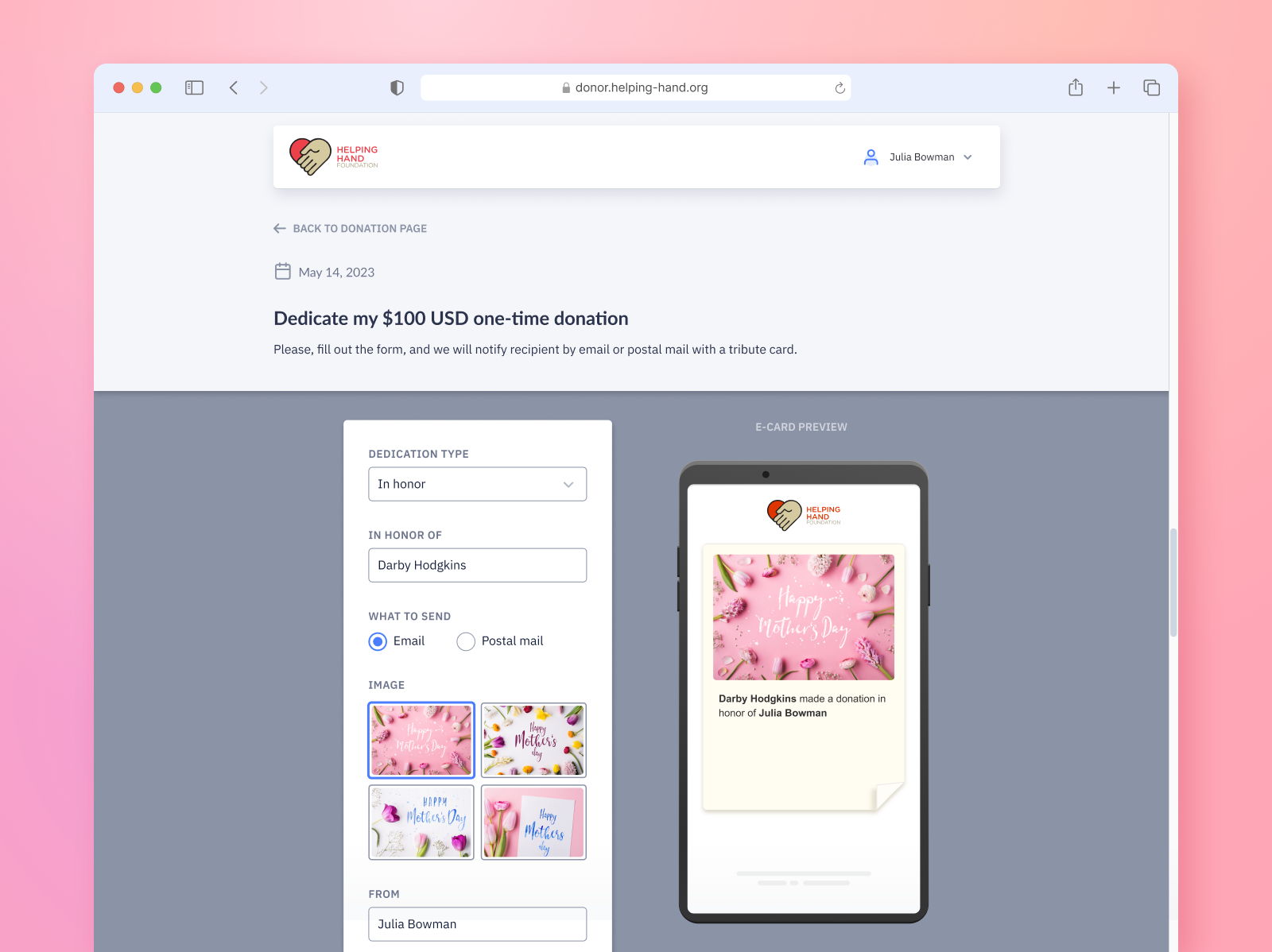 When sending a card, donors can select a dedication type (in honor or in memory), pick a channel (email or postal mail), opt to show or hide the donation amount and choose a custom image.