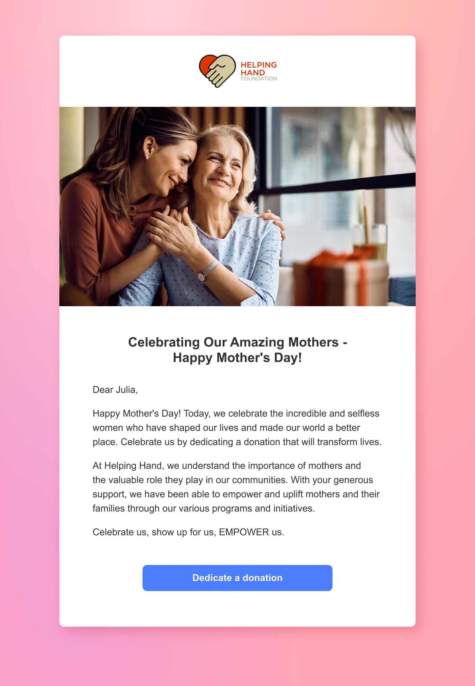 For this Checkout, we only enable the Mothers’ Day image collection because we have a special set of images we want to use for this campaign. When you send a tribute email from Donor Portal, it looks like this: