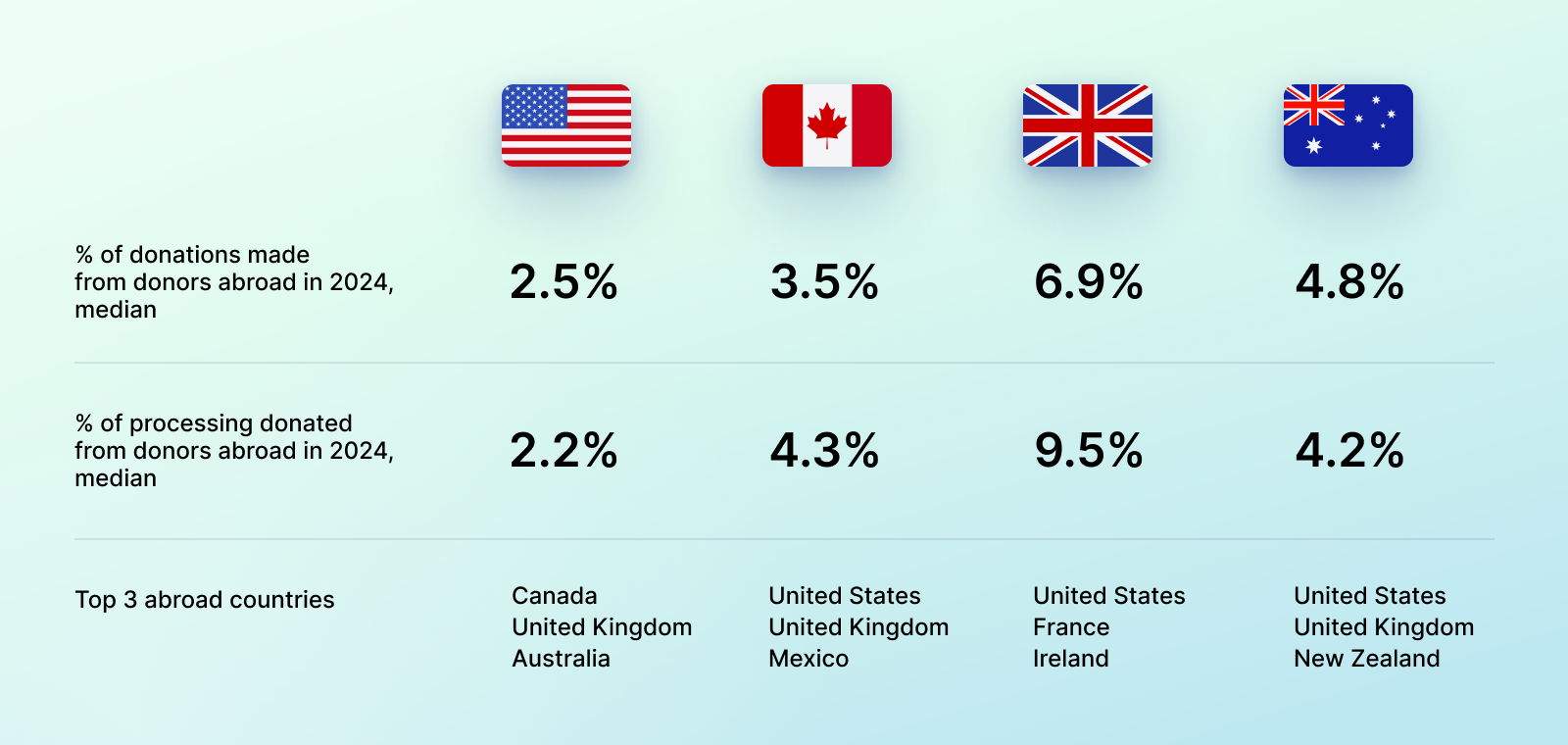 - International giving is growing. In countries like the UK and Australia, 5–7% of donations come from outside the country. That figure is 2–3% in the United States and Canada. These gifts rely on language accessibility.