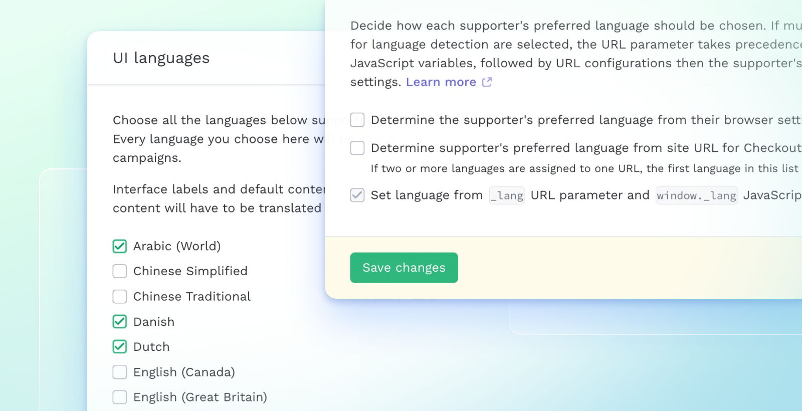 Fundraise Up makes localization powerful, yet incredibly simple. From your organization’s settings, you can enable supporter-facing languages in just a few clicks. Check the boxes, set your defaults, and you’re ready to go.