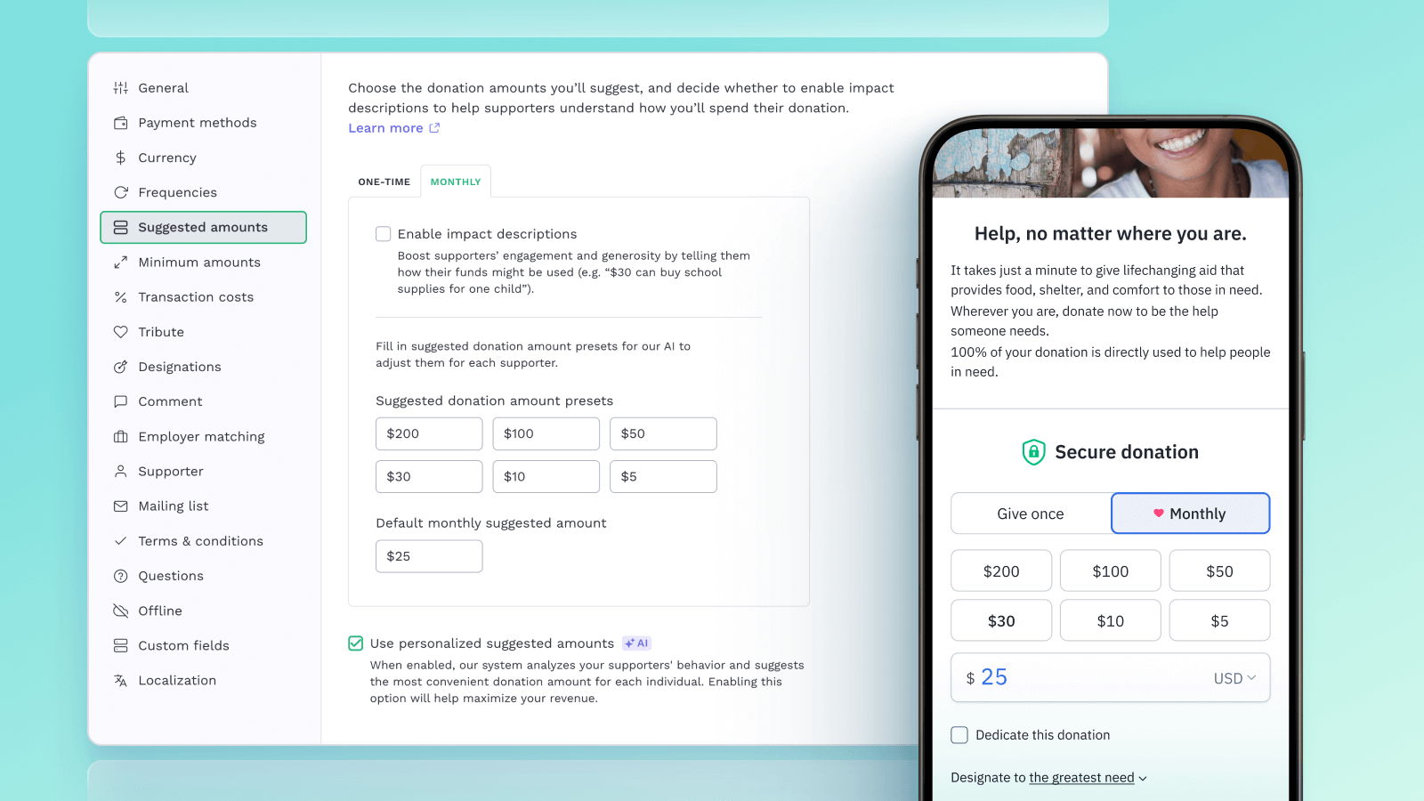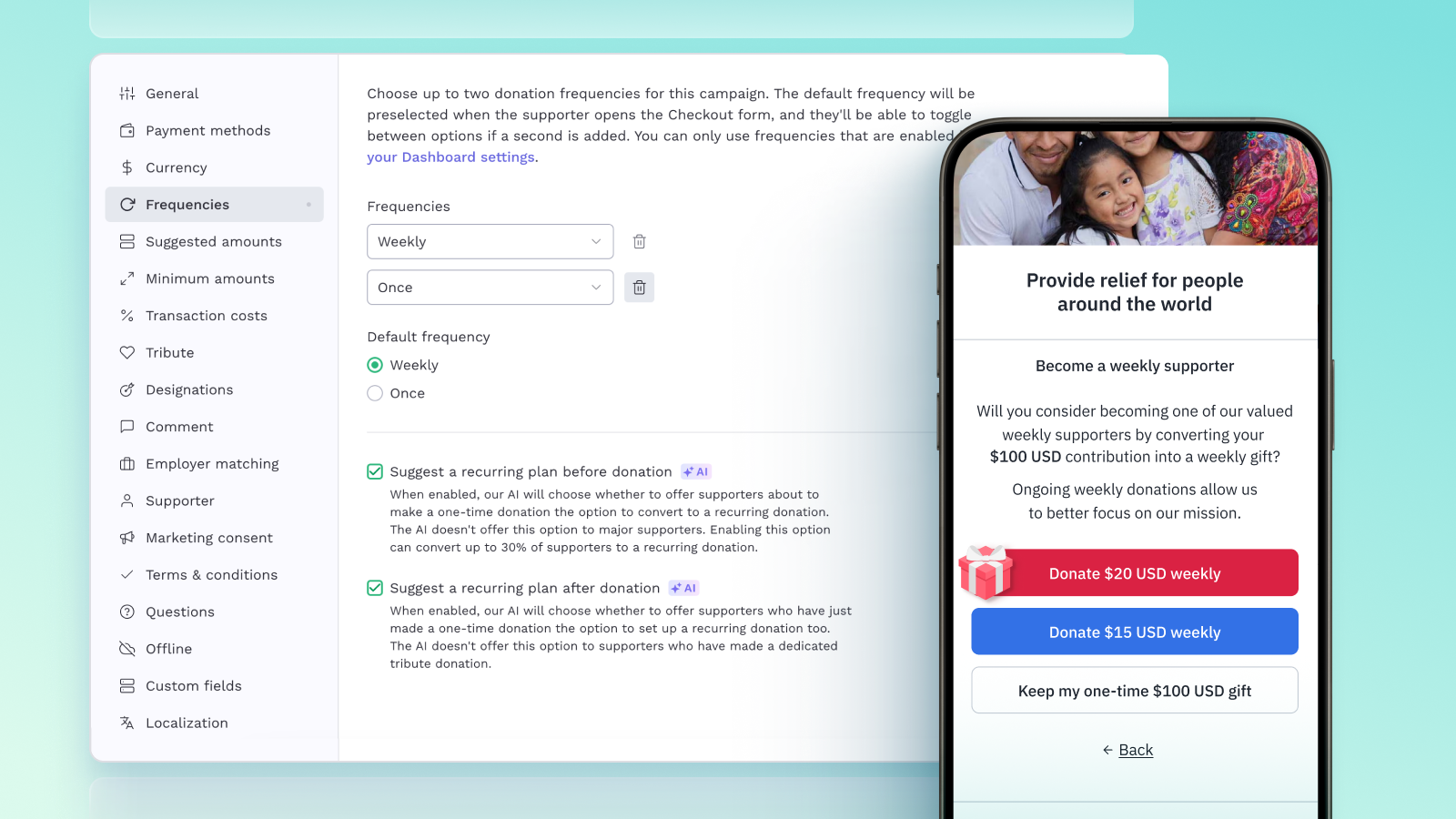 How to enable: Check “Suggest a recurring plan before donation” and “Suggest a recurring plan after donation” in your campaign settings. Learn more about upselling.