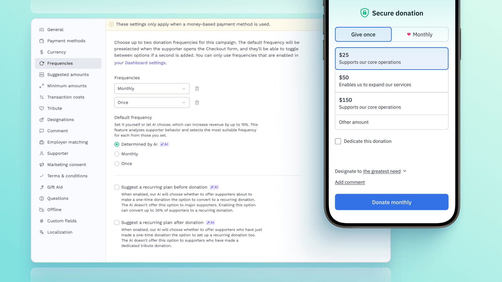 The solution: Fundraise Up’s AI can now optimize the default donation frequency in real time. Our AI analyzes donor behavior to suggest the frequency most likely to drive conversions — monthly or one-time — ensuring donors see the option that resonates best with them.