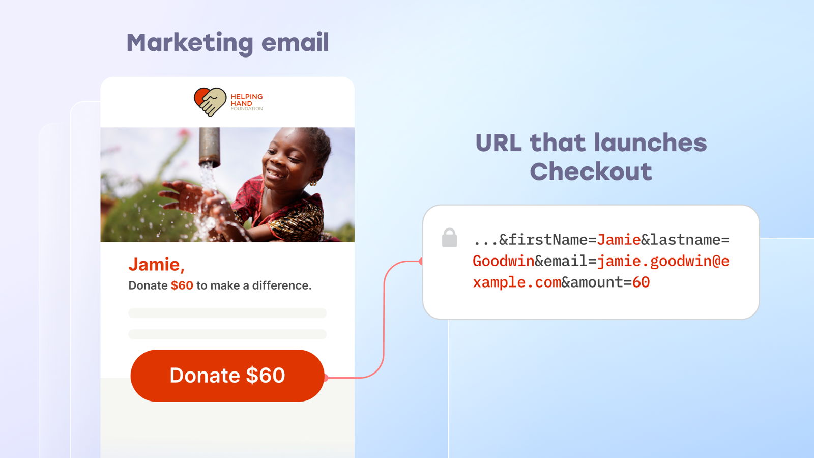 In the illustration above, the marketing email includes a donation link that appends the email recipient's personalization merge tags to the donation link that launches Checkout.