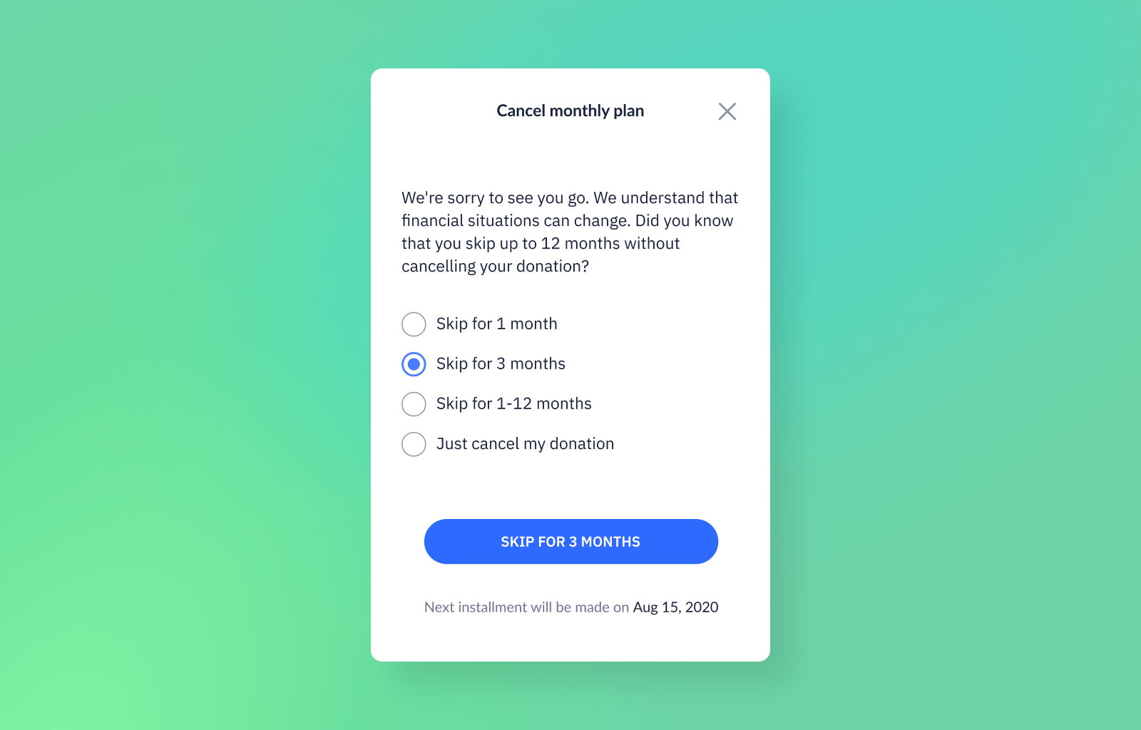 Rather than canceling their recurring plan, a donor can put it on pause for a few months.