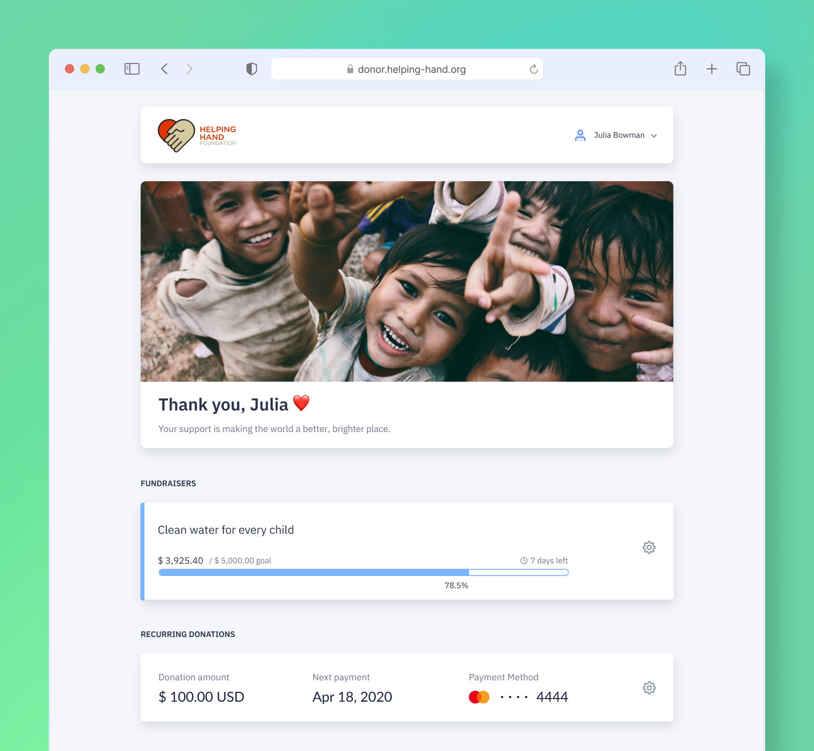 Donor Portal is a free self-service dashboard that every donor has access to when your organization uses Fundraise Up. It's easy to use and access — donors don't even have to worry about managing yet another username and password — Donor Portal is accessible using a secure, magic link.