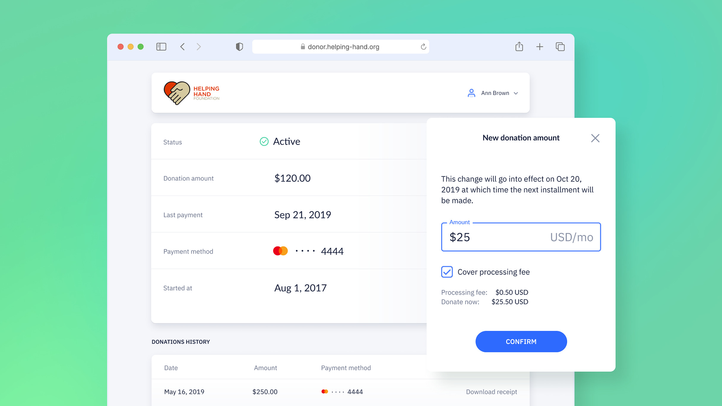 Donor Portal gives your donors easy access to their recurring plans, receipts, and even P2P Fundraisers they're running.