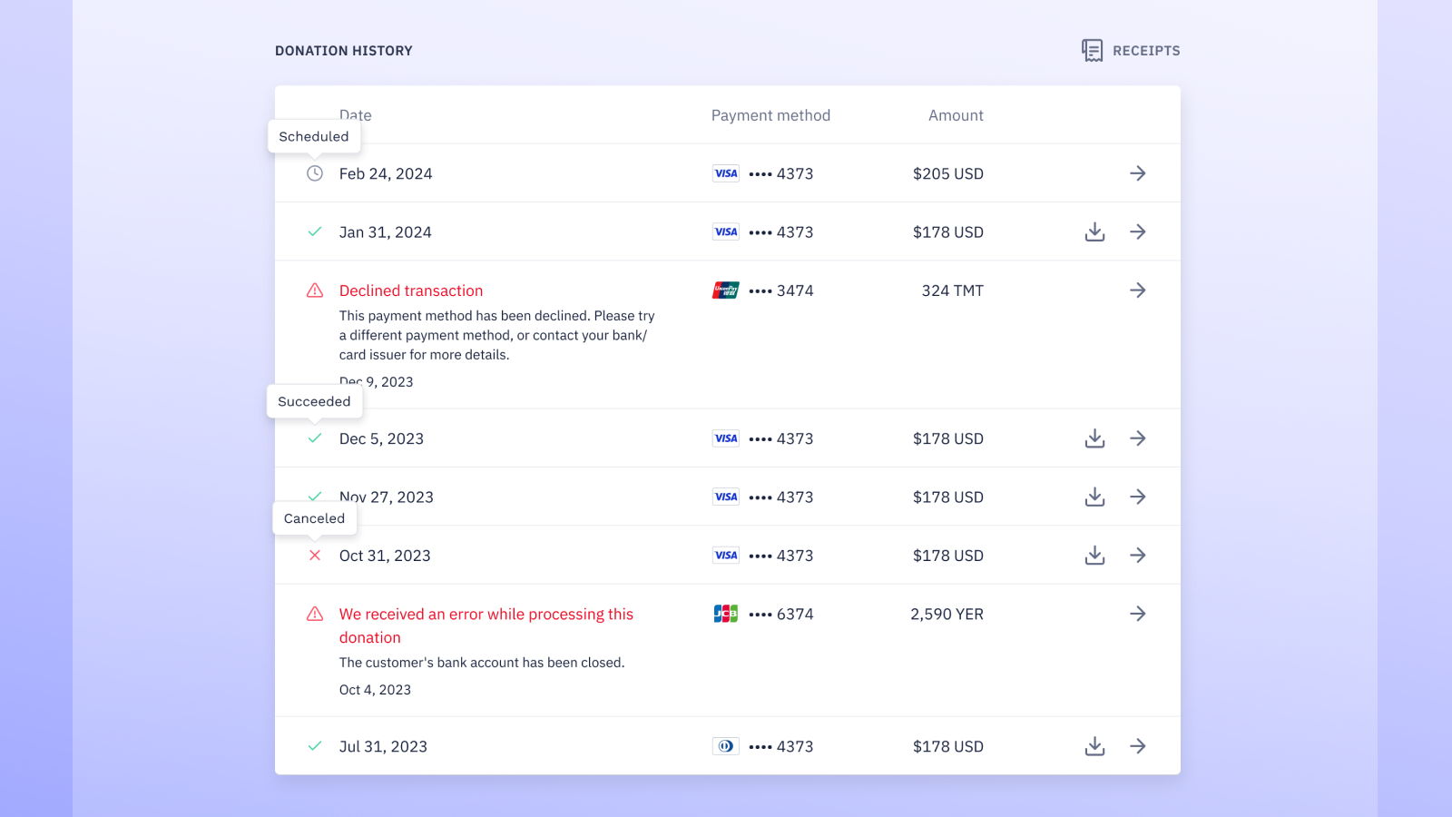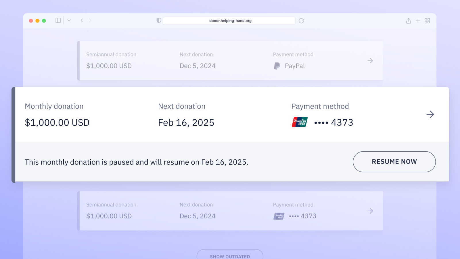 Sometimes life gets in the way, and donors pause their recurring donations. Our data shows that financial challenges are a common reason for cancellations, but most donors don’t want to stop contributing entirely — they just need to pause them. In fact, 1 in 4 potential cancellations remain donors when they discover how simple it is to pause or adjust their contributions instead.