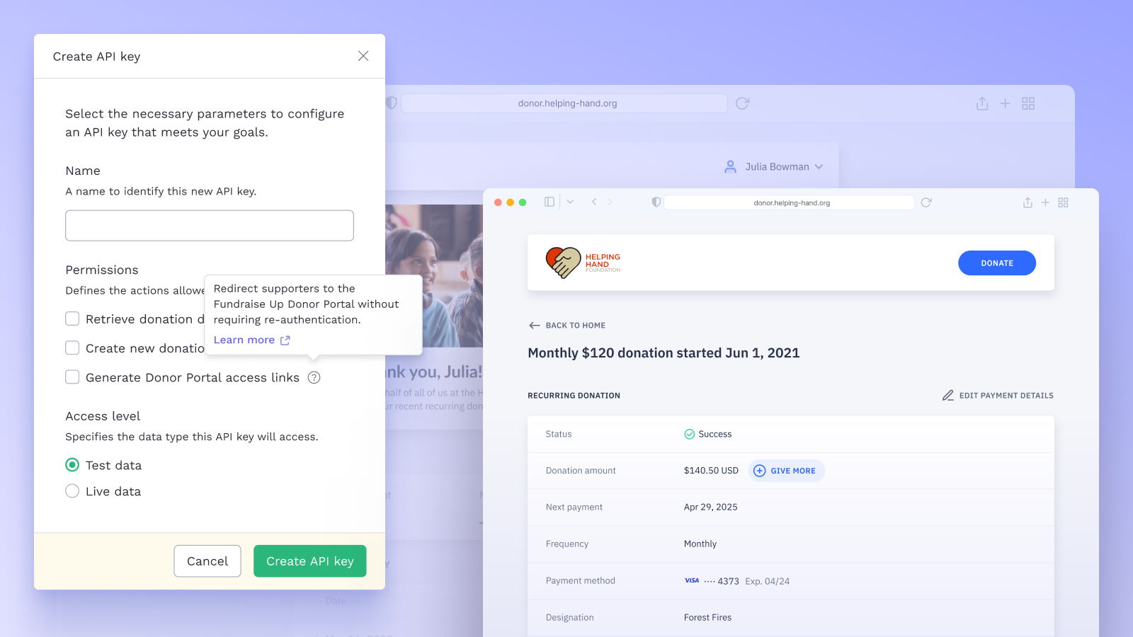 Already have your own donor portal? No problem. With our seamless Donor Portal access feature, you can integrate Fundraise Up’s powerful tools directly into your existing platform via API.