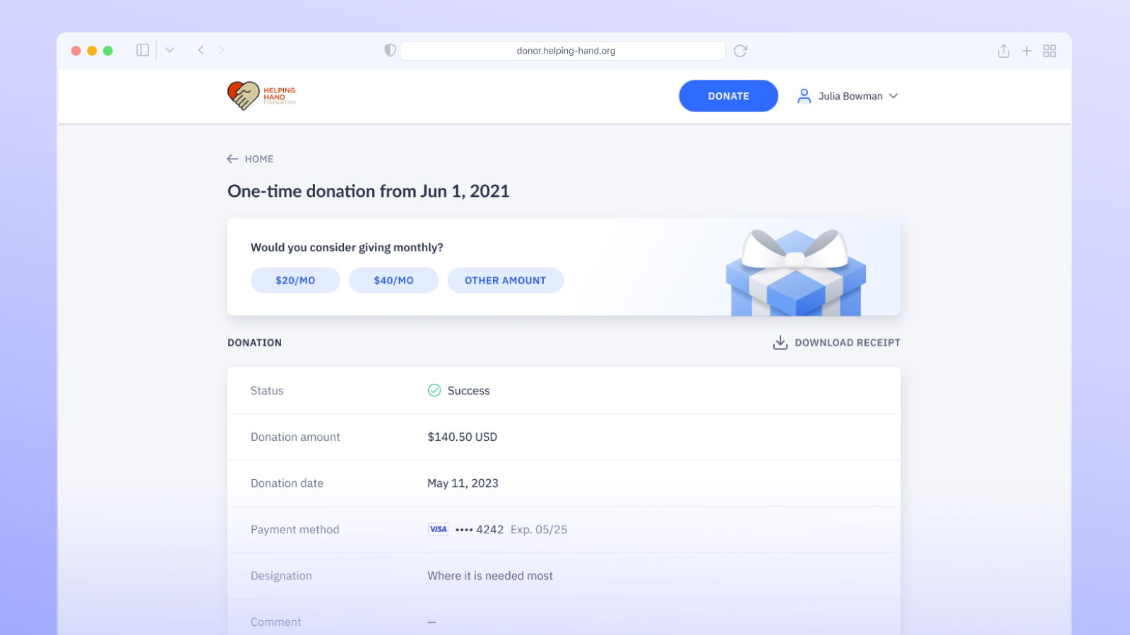 • Fewer support requests: Empowering donors to manage their giving reduces administrative overhead for your nonprofit.