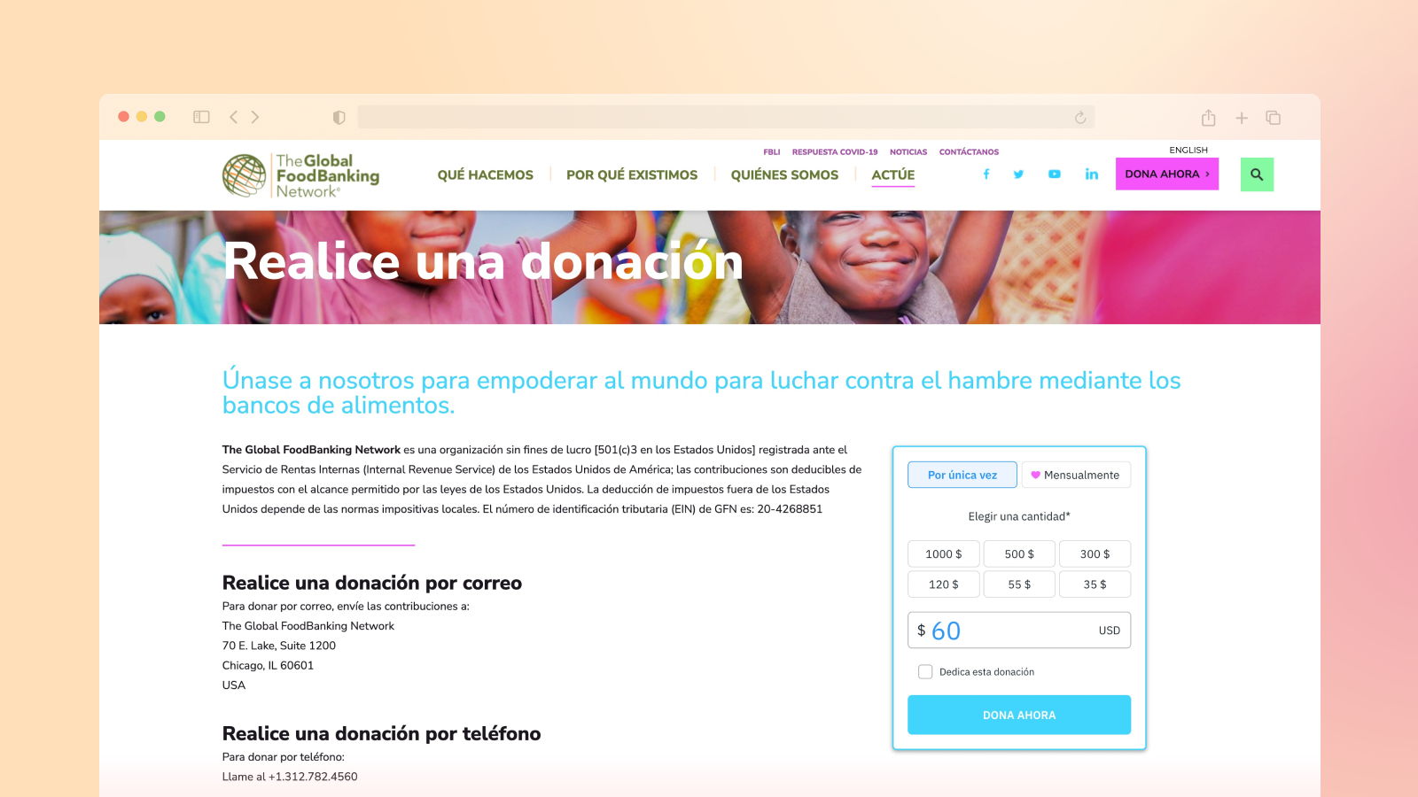 A great example of how to do it right is The Global FoodBanking Network’s website. Using Fundraise Up, the organization is able to add various localized Elements — like a donation form, call-to-action-buttons, and donation reminders — to tailor its content to both its English-speaking and Spanish-speaking visitors.