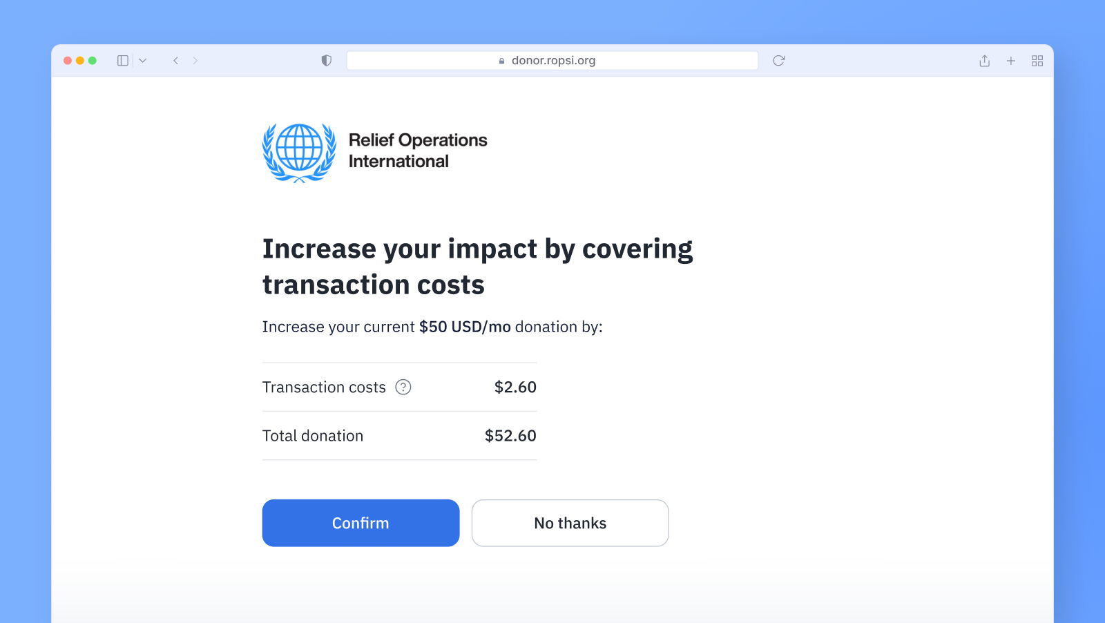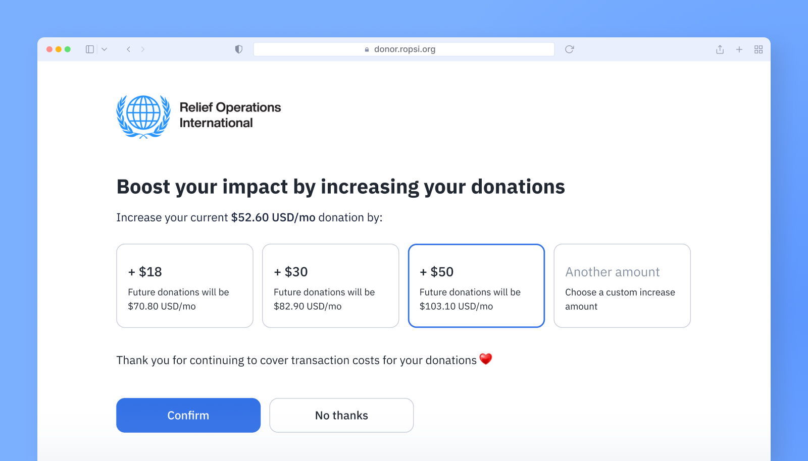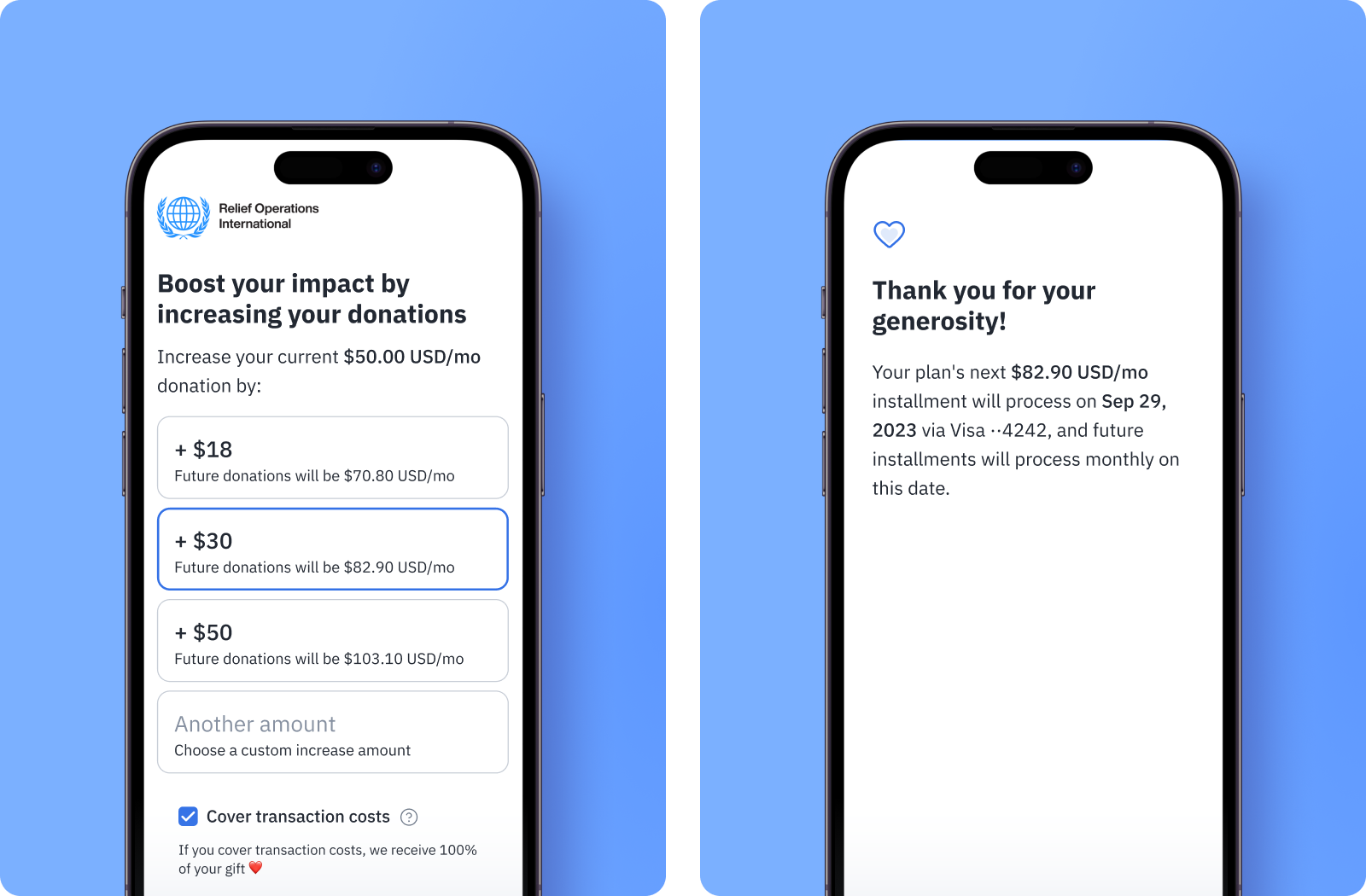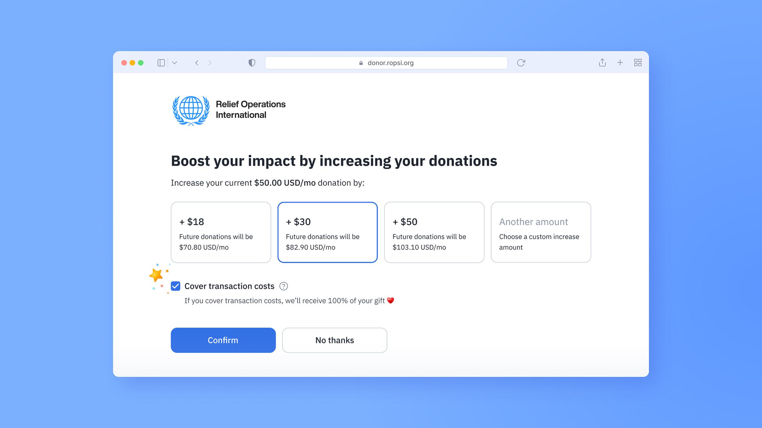 Cost coverage upgrades encourage donors to cover the transaction fees associated with their recurring donations. It’s an effective way of reducing costs and increasing revenue from recurring giving.