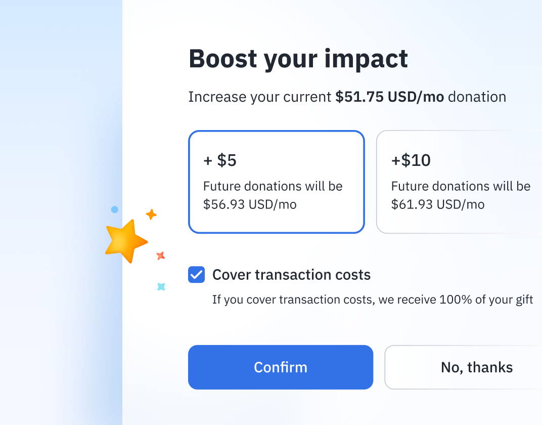 - Increase recurring donations by up to 100% with one-click gift upgrades. Donors can easily select personalized upgrade amounts and increase their gifts with one click, without needing to re-enter their payment details.