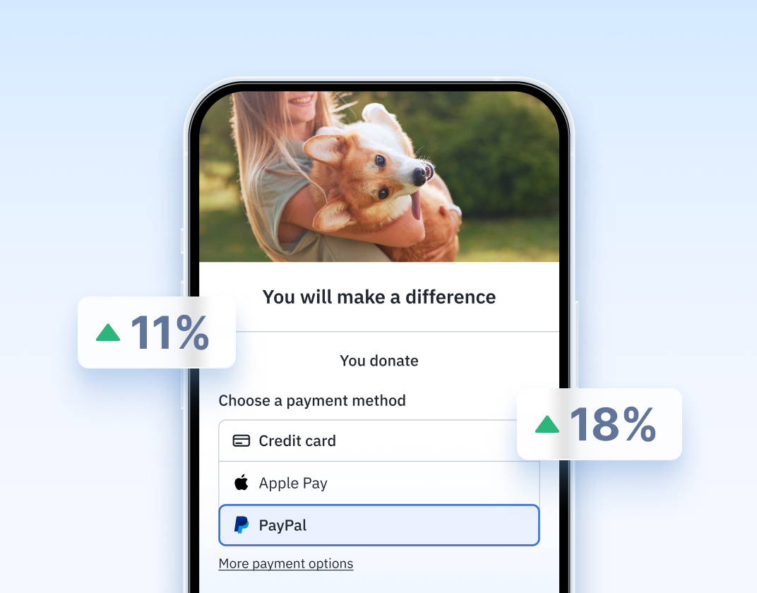 | Dynamic payment methods | Checkout experience speeds up transactions by dynamically displaying payment methods that match donors’ devices and local payment preferences. SEPA, Direct Debit, PAD, Apple Pay, Google Pay, PayPal, and Venmo display based on the donor’s location, mobile device, and browser | Payment methods are static and do not adapt to the donors’ preferred payment options |
