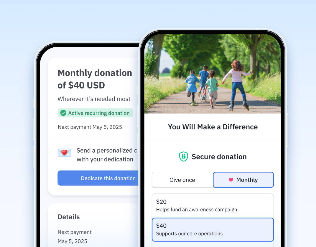 - Give donors the flexibility to pay their way — including mobile wallets, ACH and PADs, crypto, and other globally accepted methods — for both one-time and recurring donations.
