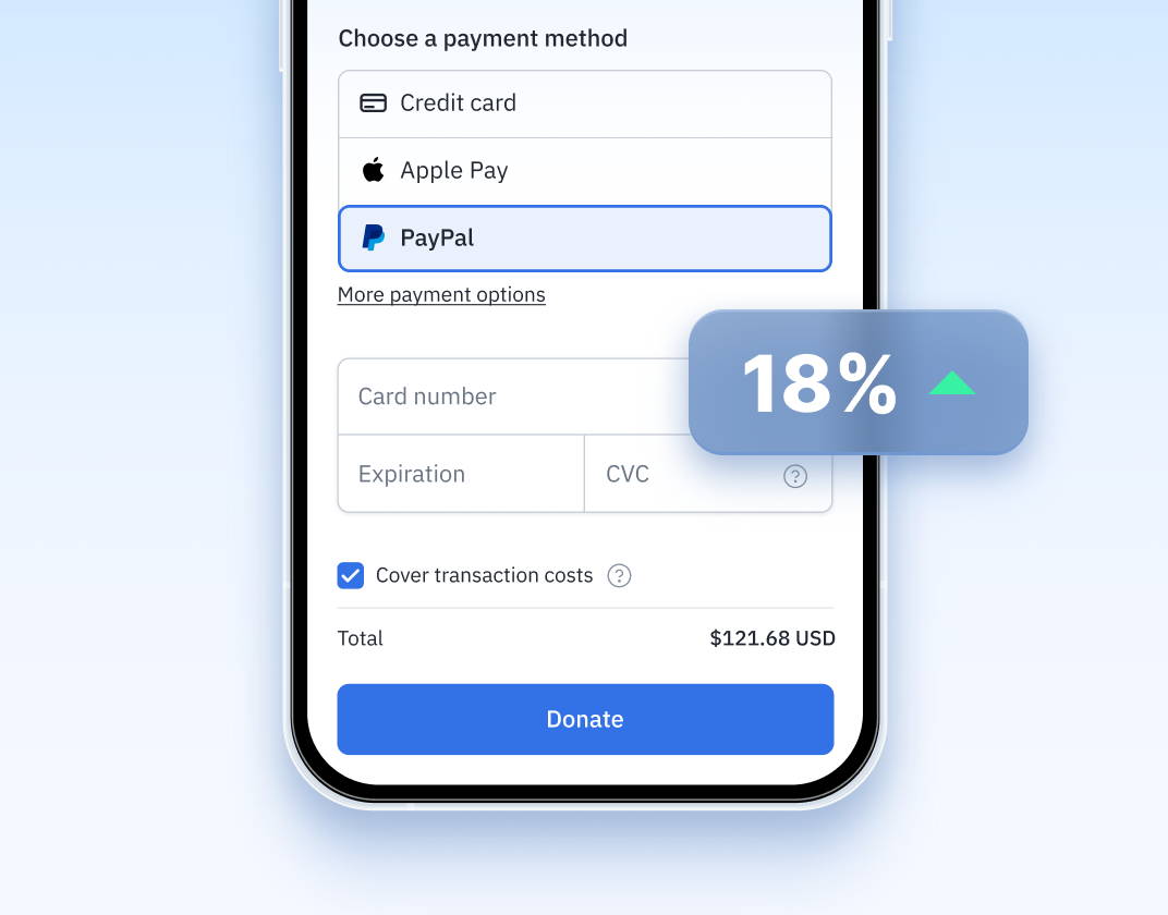 - PayPal, a globally trusted payment method, delivers an 18% conversion rate when enabled, with one-time donations averaging $117.