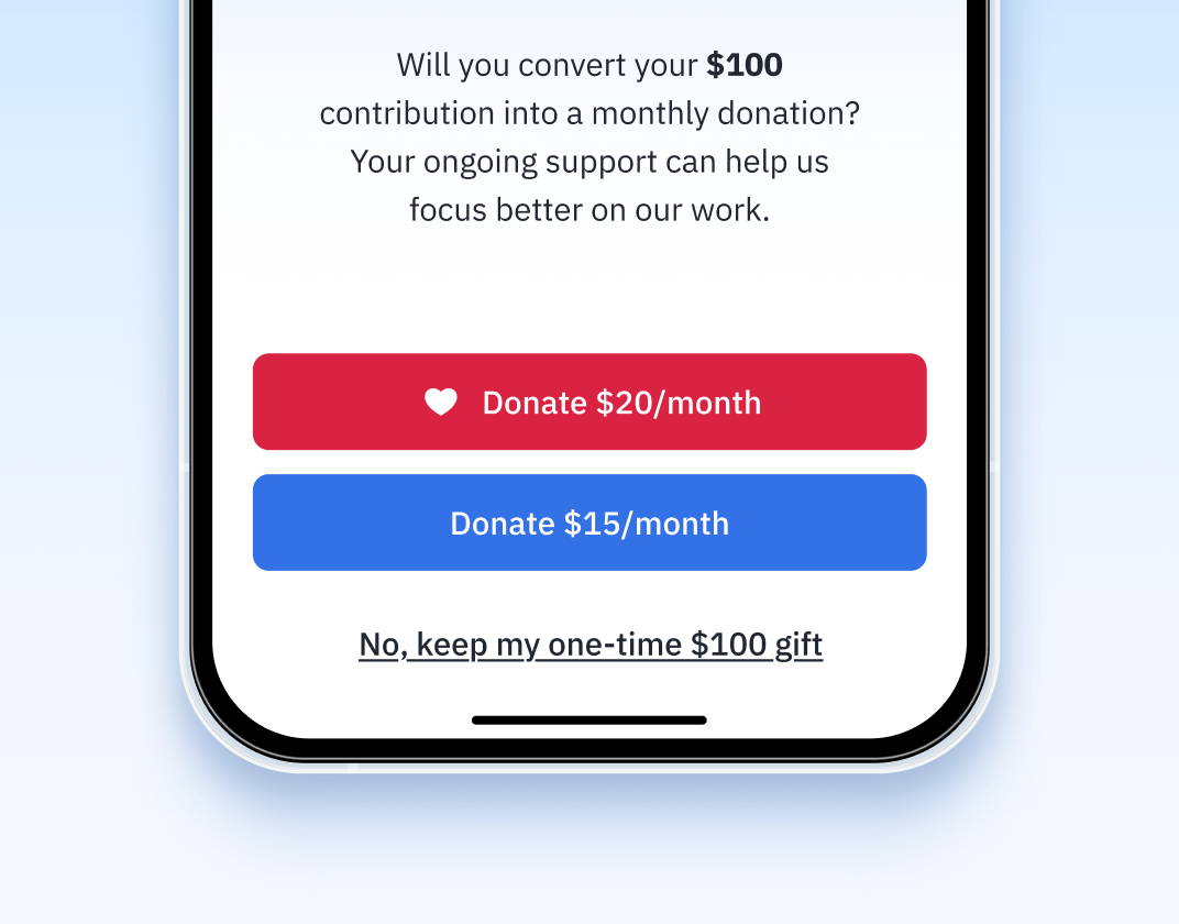 Our AI features convert one-time donors into recurring sustainers. We offer built-in upgrade options that encourage donors to increase their recurring donation amounts.