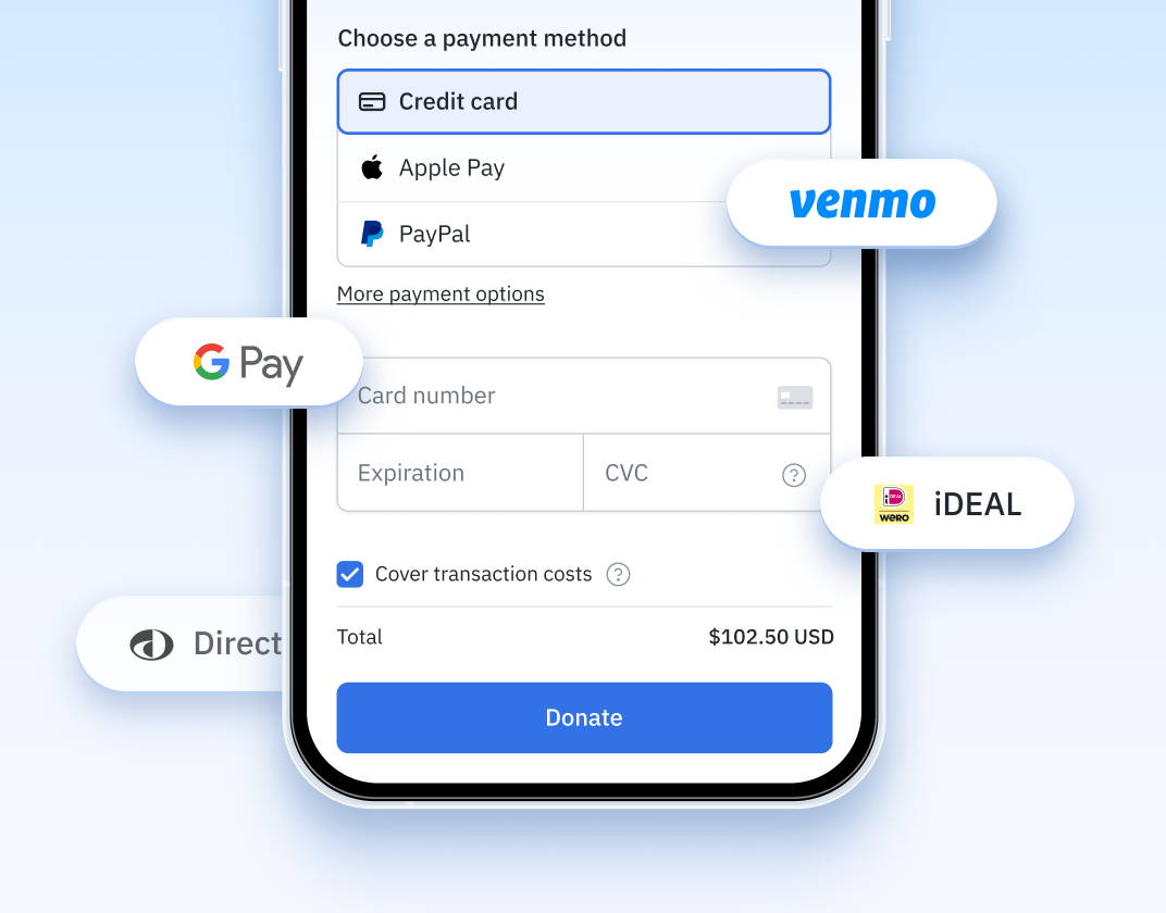 | Payment methods | The Checkout on the donation form is designed to detect and display preferred and country-specific payment methods, helping donors to complete donations in seconds. SEPA, Direct Debit, PAD, Apple Pay, Google Pay, PayPal, and Venmo display based on the donor’s location, mobile device, and browser. | Payment methods are static and do not adapt to the donors’ preferred payment options |
