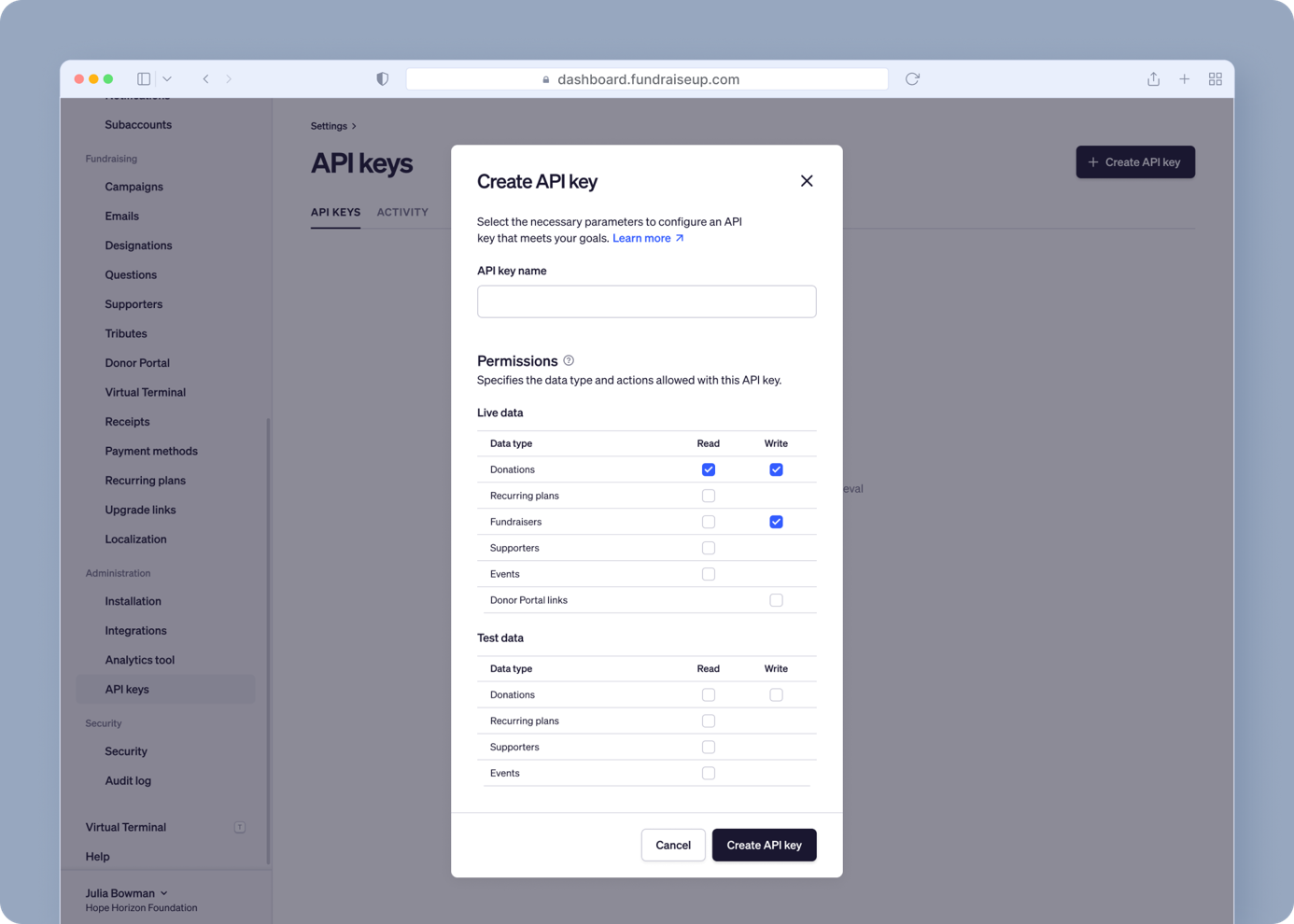 You can now set read and write permissions independently for each resource type — donations, supporters, events, recurring plans, and Fundraisers. This replaces the previous bundled permission model.