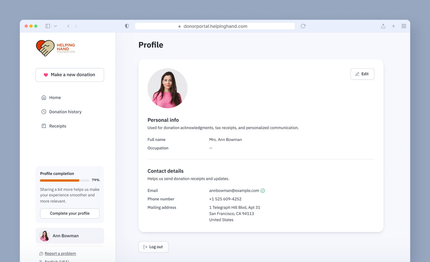 The Donor Portal now includes a dedicated Profile section where supporters can manage their personal information. Previously, phone numbers and mailing addresses were only editable within recurring plan settings, while name and email were in a separate Settings area.