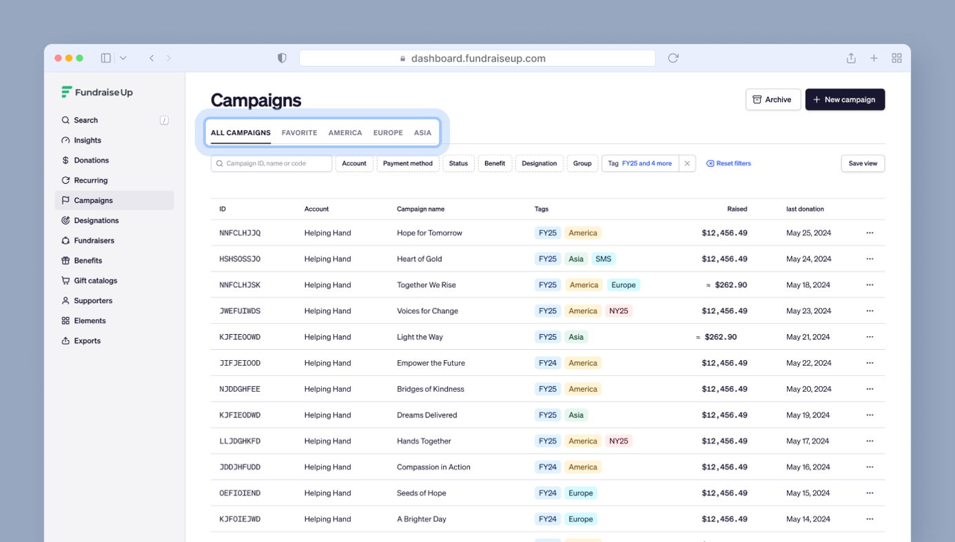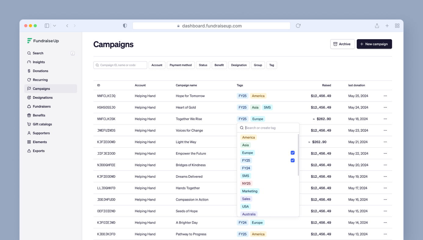 You can now tag your campaigns in Fundraise Up with color-coded labels to organize them by channel, region, fiscal year, or any other category.