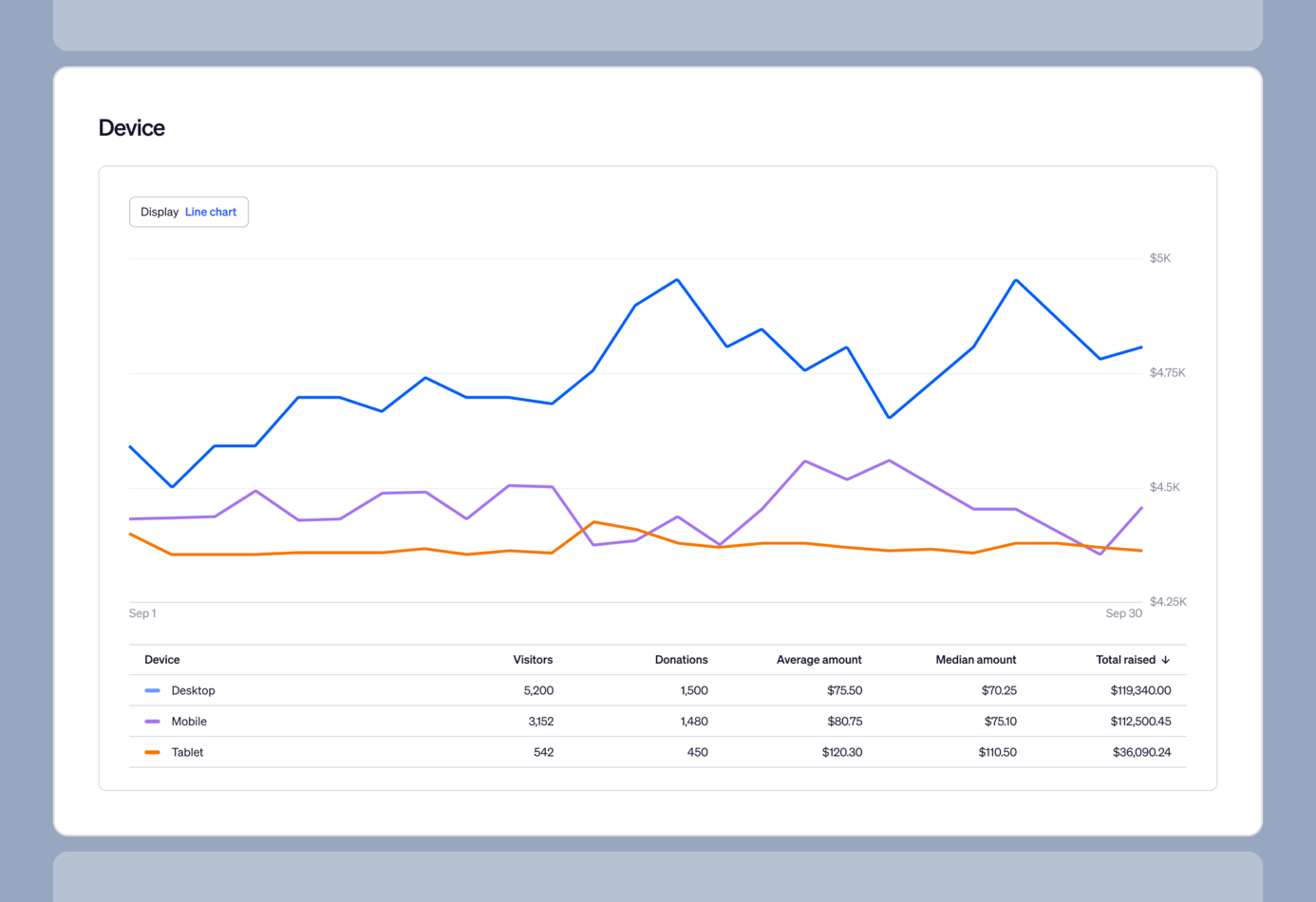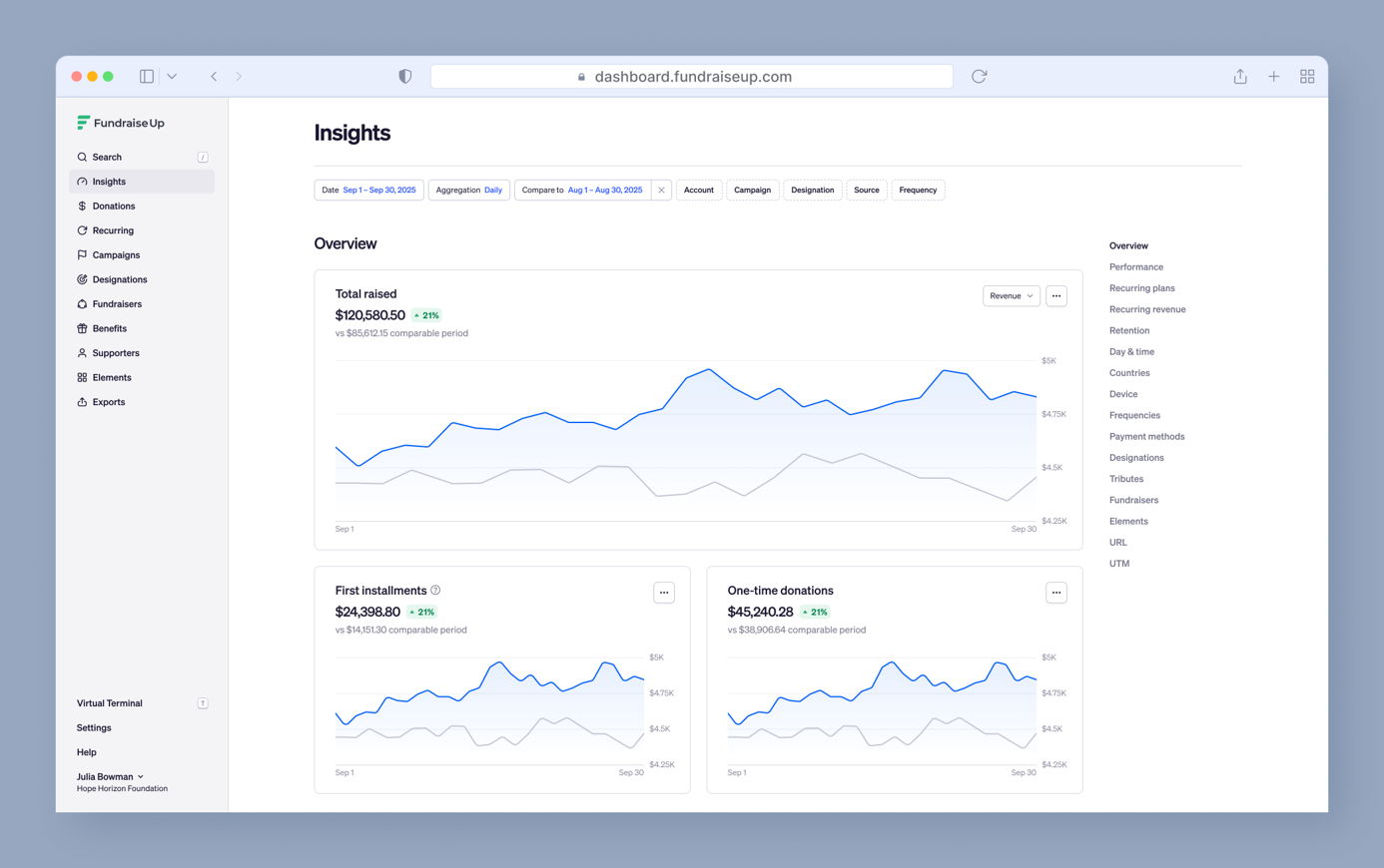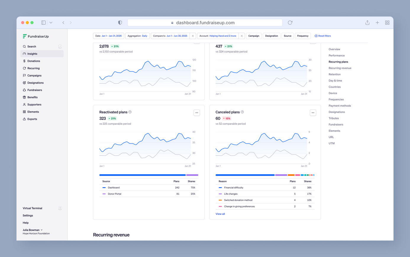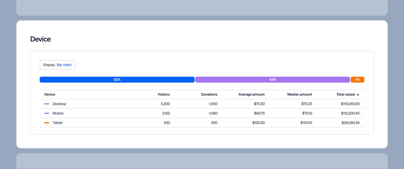 We updated Insights to help you analyze your fundraising data faster. The update includes sticky filters, reorganized charts, better data visualization, and a new Device chart that replaces the old Mobile users metric.