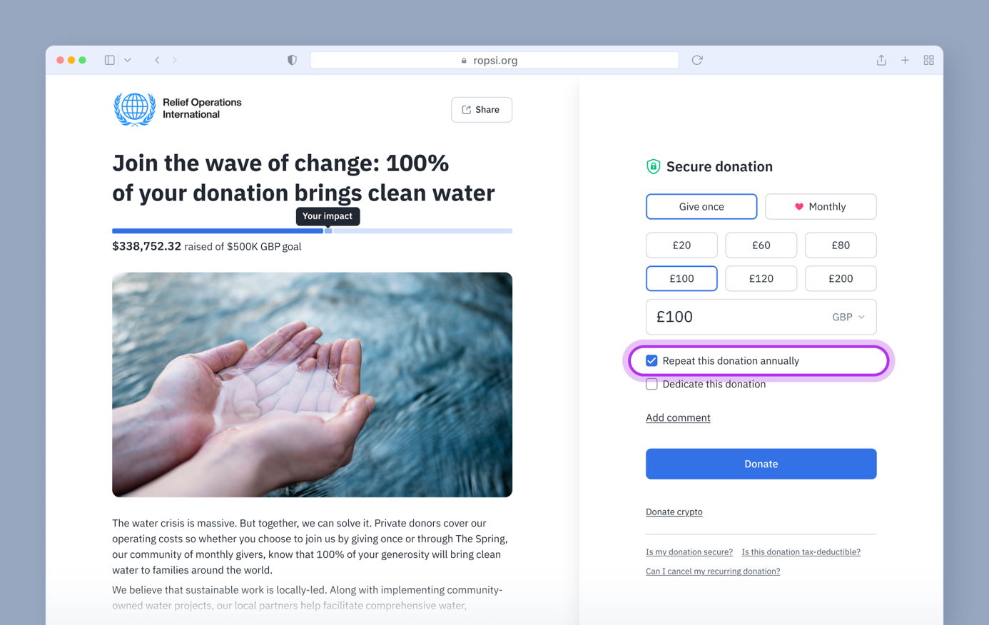 Supporters in the UK can now choose to make a one-time donation recur annually. The annual option appears below the amount selection as a checkbox labelled Repeat this donation annually. When selected, the donation button changes from Donate to Donate annually to clearly indicate the commitment.