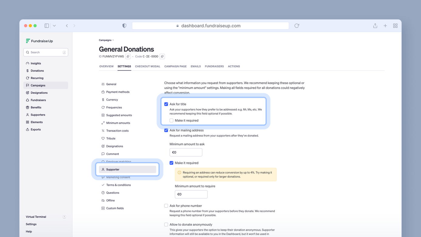Irish organizations can now enable the Title field for supporters in checkout. This allows them to use a more formal and culturally appropriate form of address for their audience in communications.