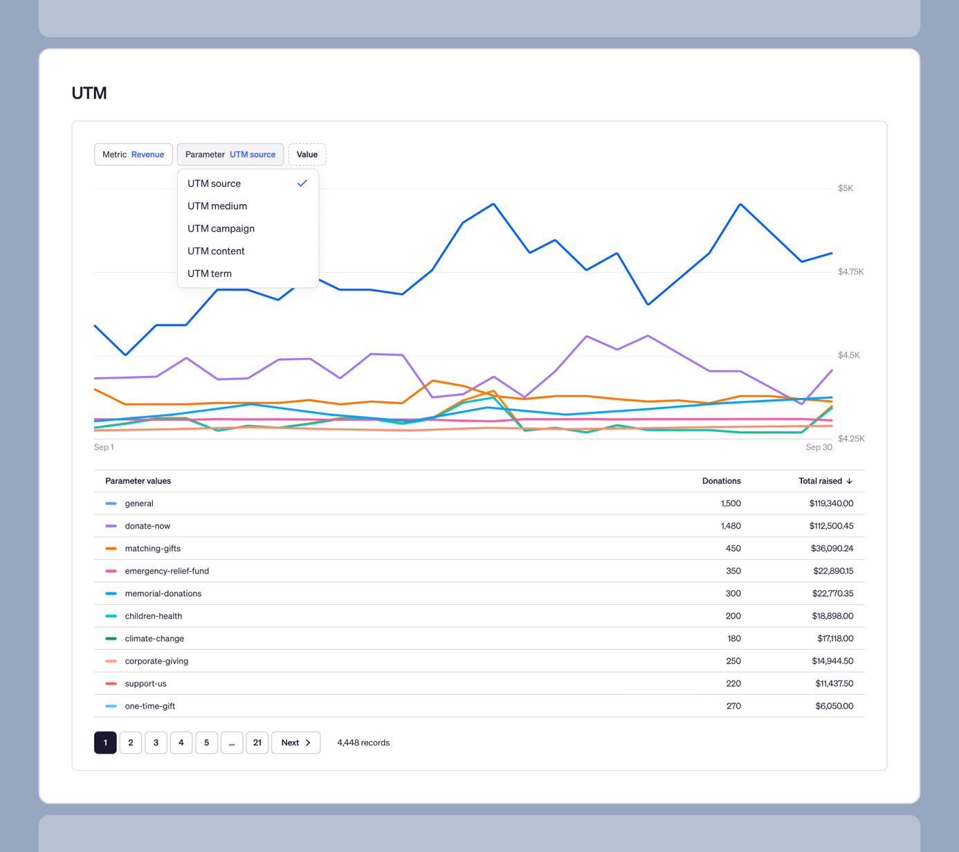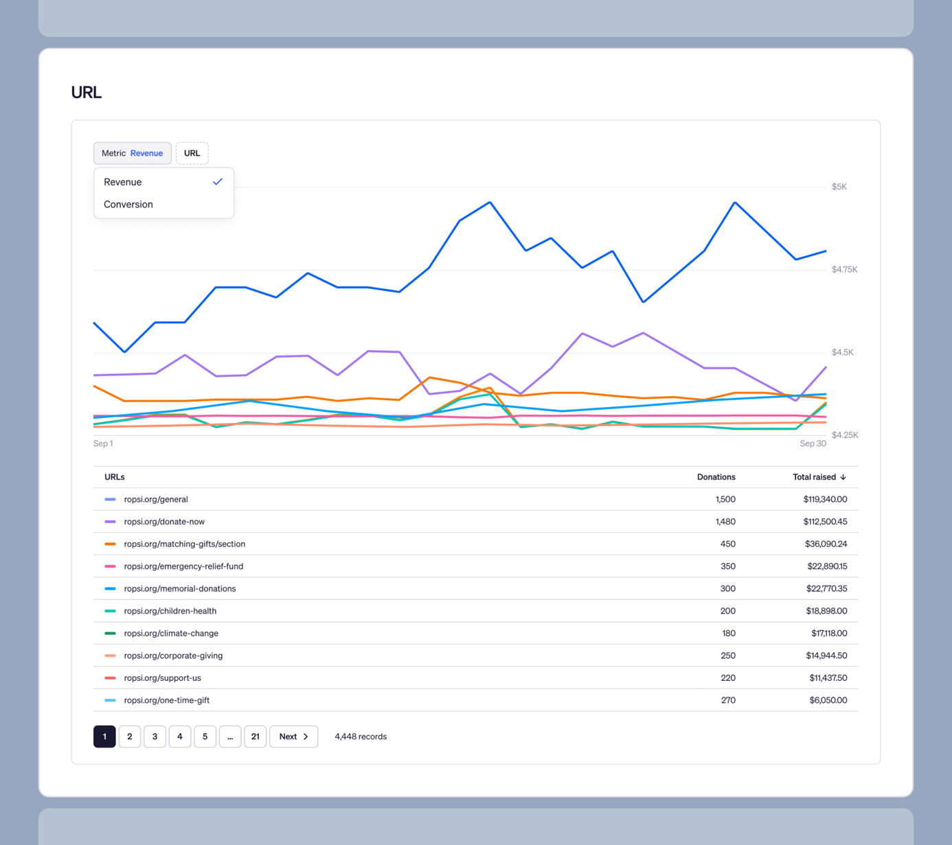 - Revenue shows total donations and total raised for each page or channel — all successful payments attributed to that source, including recurring installments.