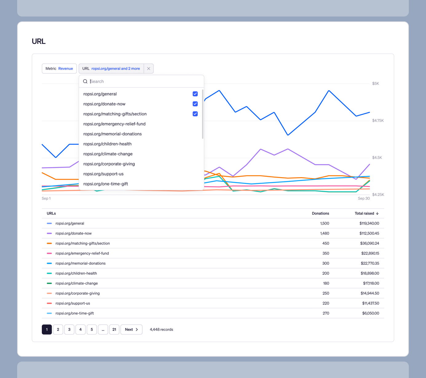 Each URL and UTM chart now has a built-in search filter so you can find specific pages or channels without going through the full list.