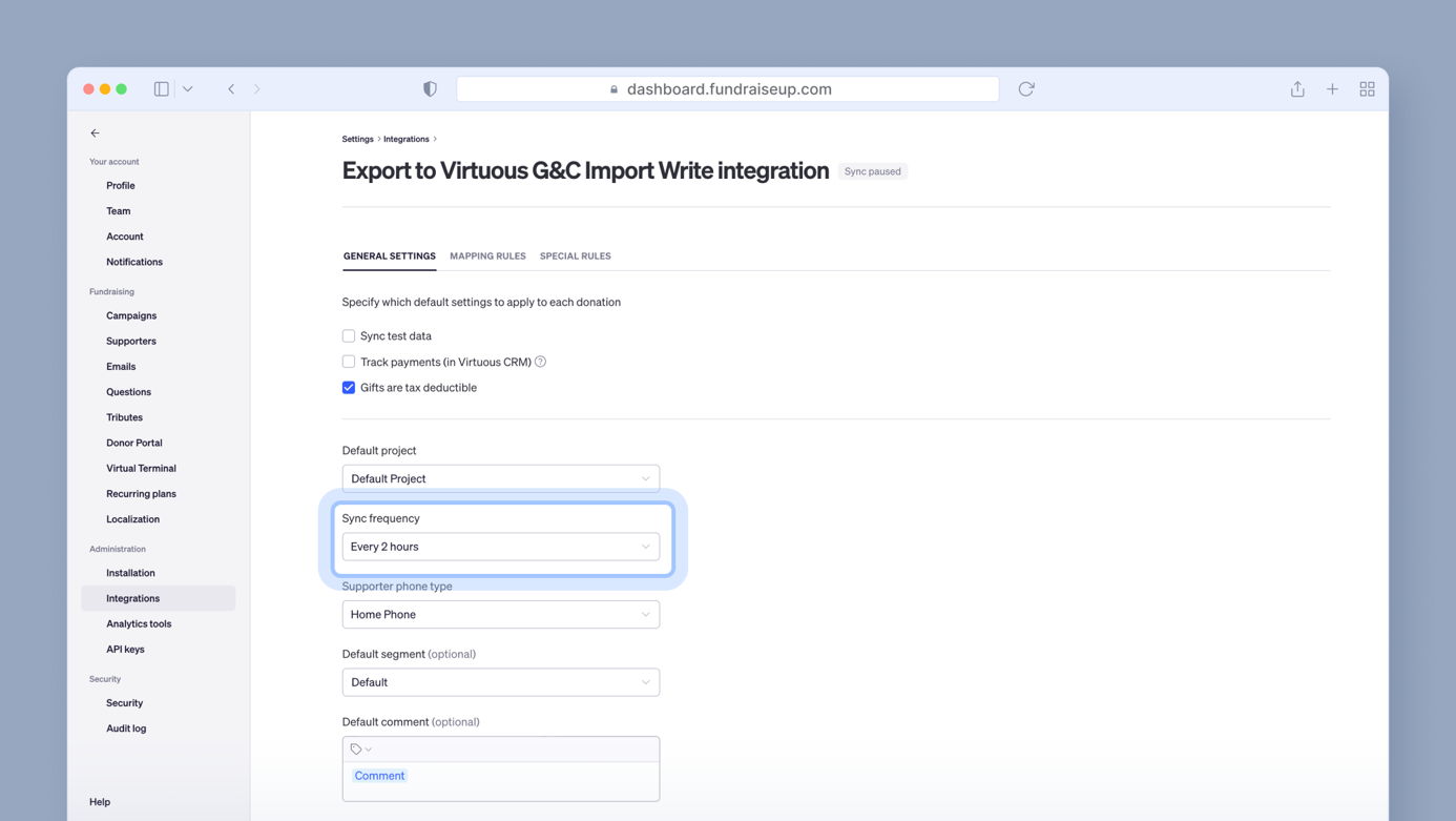 In Settings > Integrations > Virtuous G&C Import Write, there’s a new Sync frequency field where you can pick one of four schedules: