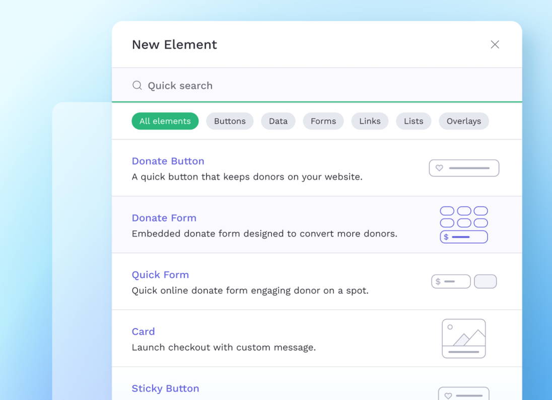 Elements are quick to create, easy to manage, and guaranteed to engage visitors on your website as donors.