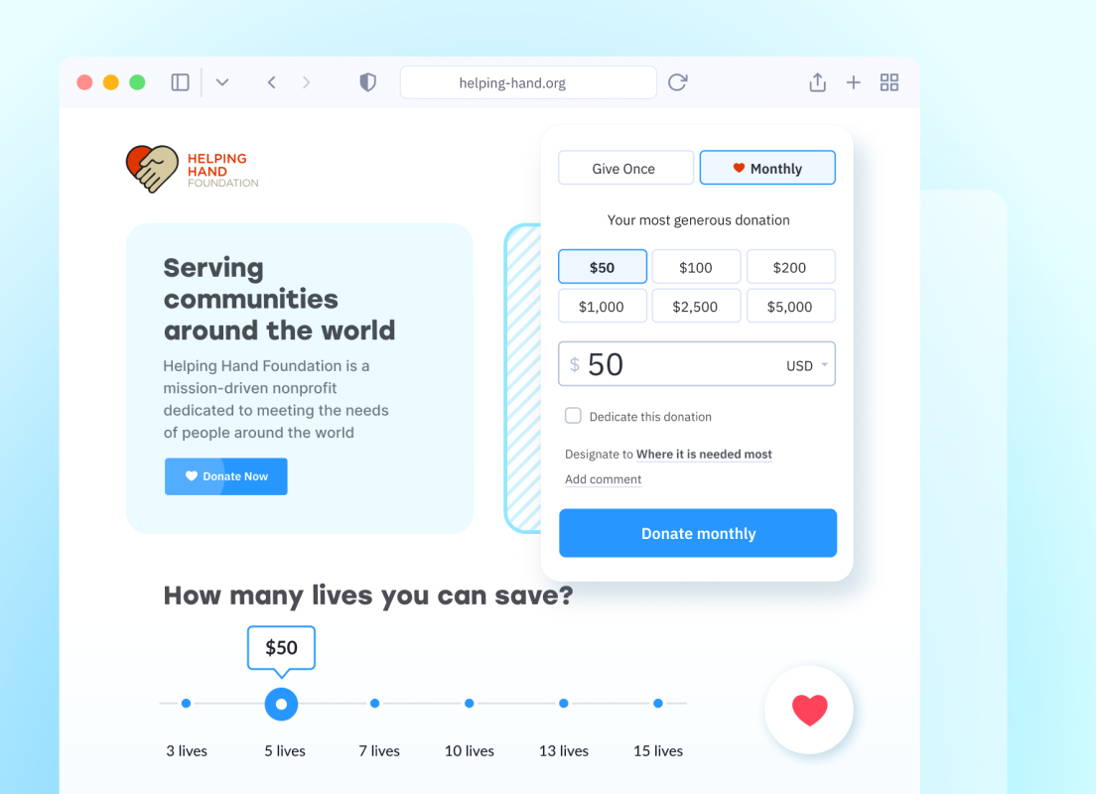 Update your nonprofit’s website with pre-built buttons, sliders, overlays, and other donation widget components that engage website visitors and convert them to donors.